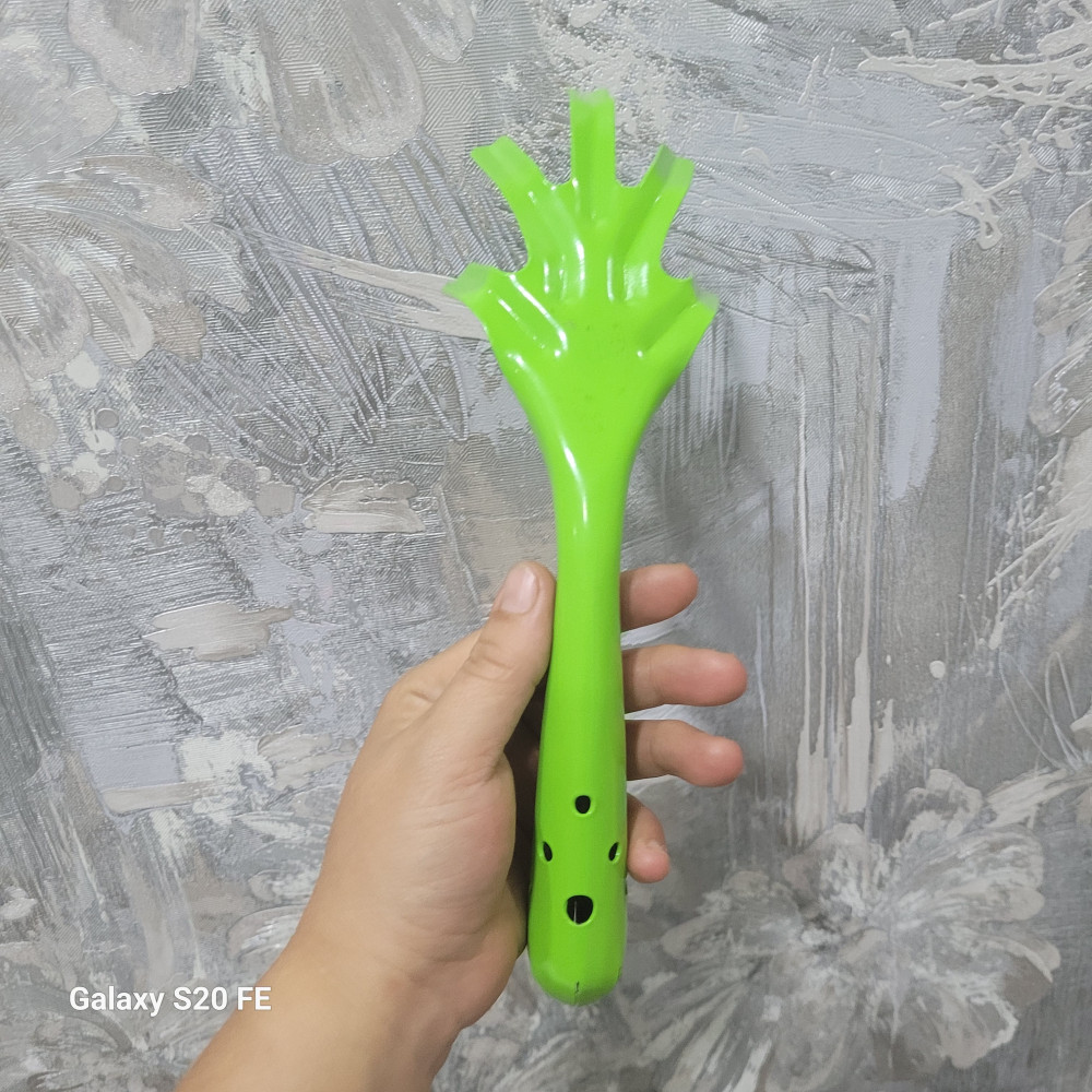Удобная ручка, зубья под определённым наклоном,а не прямые можно видеть,где стебель,ствол растения.