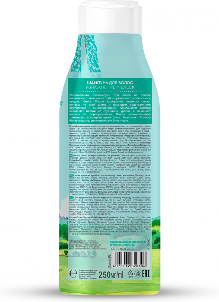 Global Bio Cosmetic Шампунь для волос «Увлажнение и блеск»