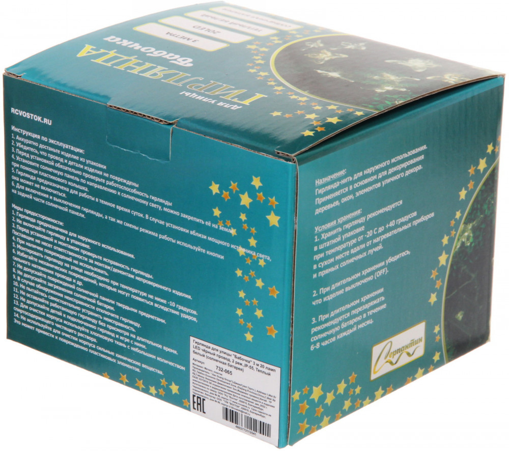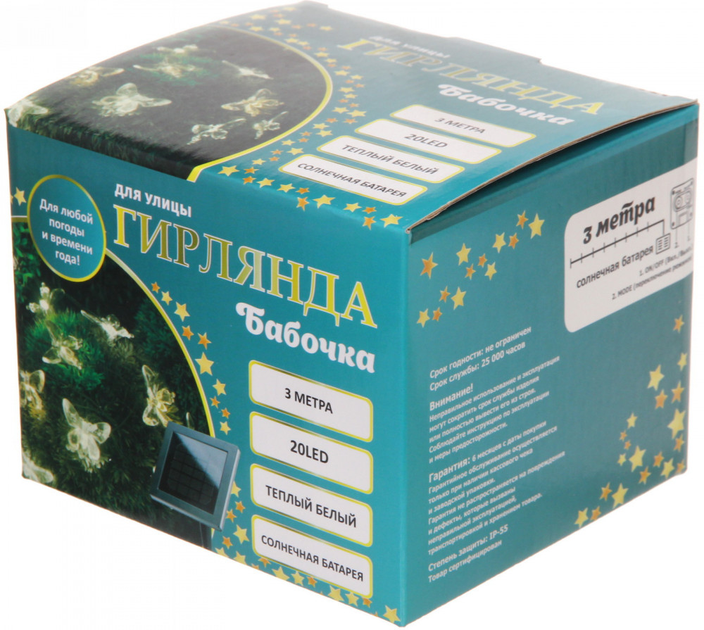 Гирлянда для улицы «Бабочка»заряд держится соответствие описанию режим свечения яркость света В данный момент этот товар отсутствует в продаже. Возможно, у нас найдется аналогичный или похожий товар здесь. Гирлянда идеально подойдет для декора интерьера дачи, деревьев, кустарников, беседки или террасы. Она не требует подключения к сети, работает от собственной солнечной батареи, заряжающейся днем от солнечного света. Заряда батареи хватает на 8-10 часов бесперебойной работы. Степень защиты IP-55 позволяет использовать ее в любую погоду. Нежные цветочки, как живые, будут сверкать и привлекать внимание окружающих. |