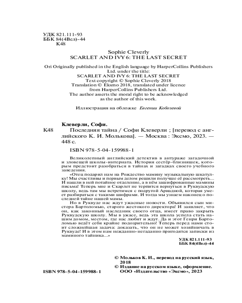 Последняя тайнаВ данный момент этот товар отсутствует в продаже. Возможно, у нас найдется аналогичный или похожий товар здесь. Серия: Детск. Скарлет и Айви. Новое оформление Каждая книга серии о тайнах и загадках Руквудской школы становится международным бестселлером. Эта история одновременно и детектив, и приключения, и увлекательный квест — полный набор сюжетных ходов, которые делают книгу незабываемой. Главные героини, Скарлетт и Айви, зеркальные близнецы, одинаковые во всем, кроме своих имен и характеров. Именно поэтому так интересно следить за тем, как они подменяют друг друга и как при этом по-разному ведут себя в одних и тех же обстоятельствах. |