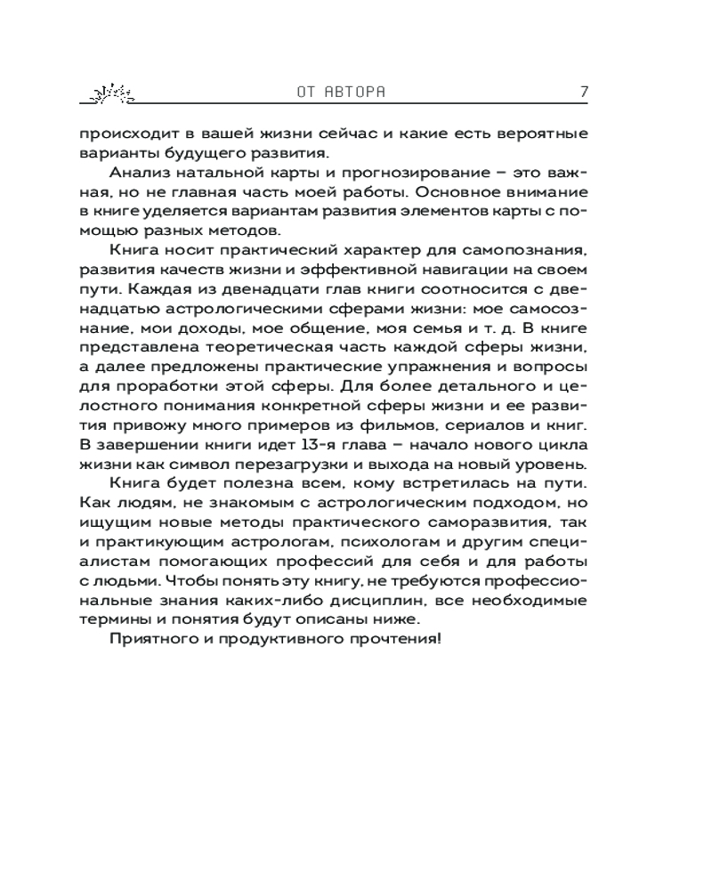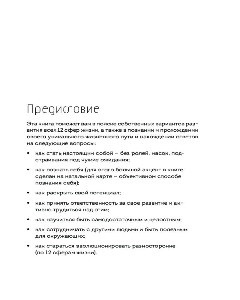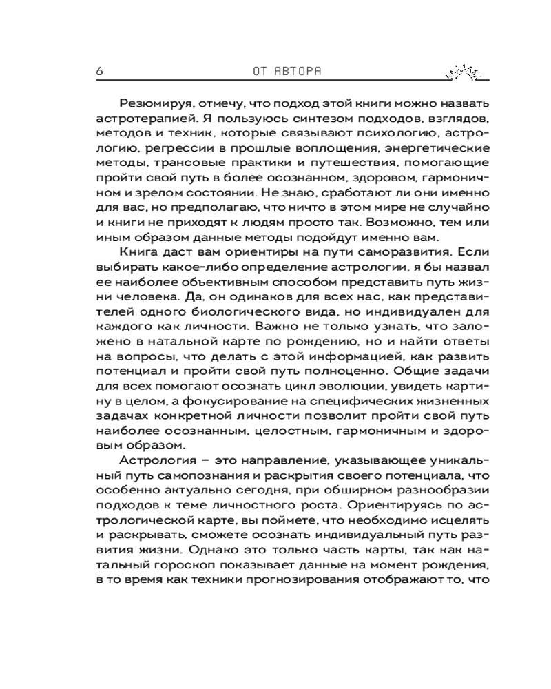 Эта книга задумана как путеводитель по просторам нашей души. За основу взяты 12 сфер жизни, представленные астрологическими домами, и предлагаются способы их раскрытия с помощью астрологических и психологических техник. Астрология поможет осознать вашу натальную карту, осмысленно и целенаправленно двигаться вперед, развивать заложенный потенциал, накапливать необходимый опыт души. Психология поможет разобраться с эмоциями, чувствами, убеждениями, интегрировать части души, исцелить травмы на уровне этой жизни и прошлых воплощений.