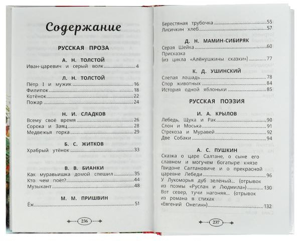 — русская проза: А. Н. Толстой, Л. Н. Толстой, Н. И. Сладков, Б. С. Житков, В. В. Бианки, М. М. Пришвин, Д. Н. Мамин-Сибиряк, К. Д. Ушинский;