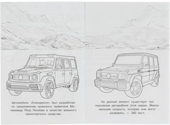 Внутри этой увлекательной раскраски ребёнка ждут иллюстрации с изображением автомобилей марки «Гелендваген» и интересные факты о них. Раскрашивание картинок разнообразит досуг детей и потренирует руку к письму. Благодаря небольшому формату раскраску удобно брать с собой в дорогу. |
