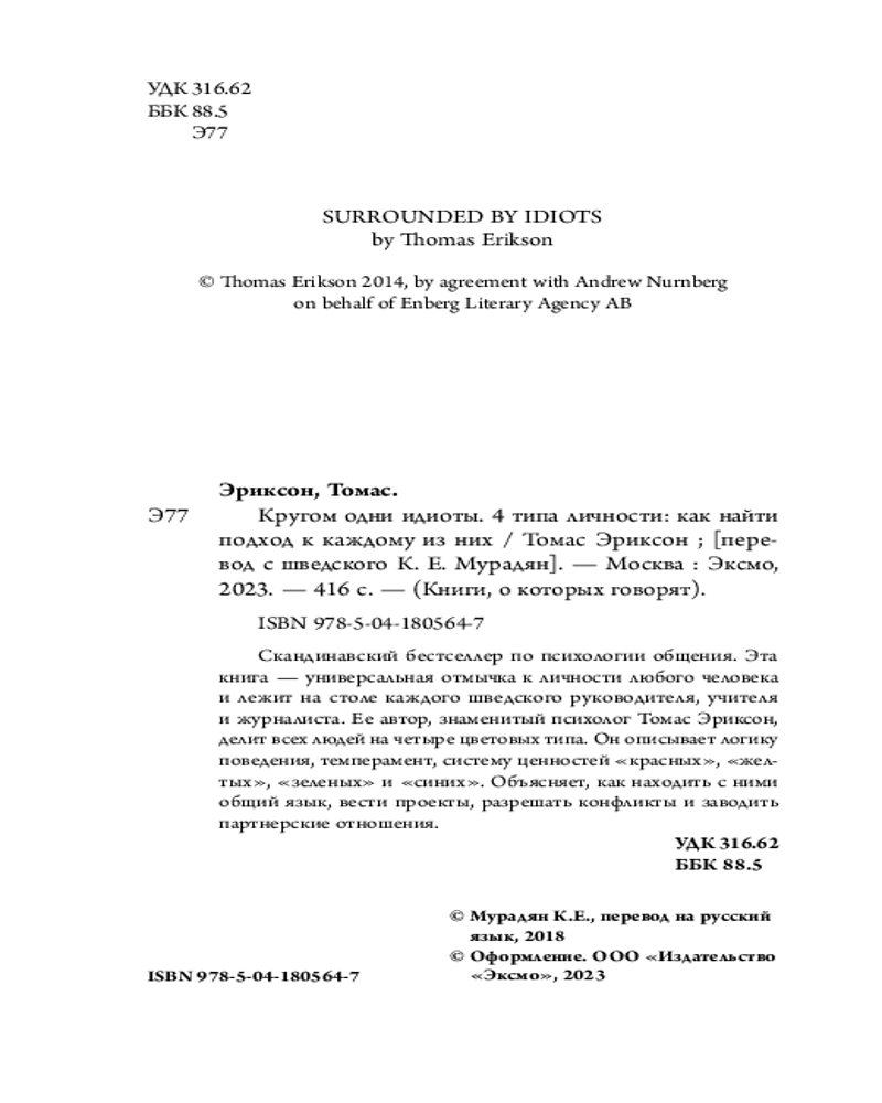 💳 Оплатить за товар можно при получении 🇰🇿 Есть бесплатная доставка по Казахстану от 1 дня 🎁 Копите бонусы с каждой покупки Серия: Книги, о которых говорят «Кругом одни идиоты» побила все рекорды шведского книжного рынка! Она стала одной из немногих скандинавских книг по популярной психологии, которая была переведена на 22 языка и продана общим тиражом 550 000 экземпляров! В течение двух лет книга держится в Топ-5 нехудожественных произведений среди всех скандинавских изданий и не собирается сдавать позиций. |