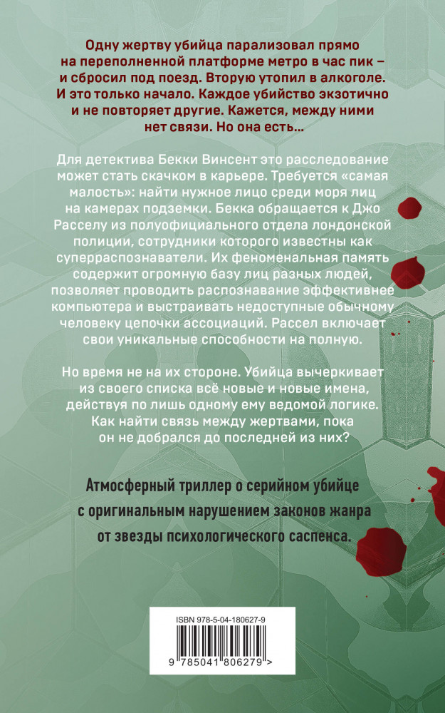 Для детектива Бекки Винсент это расследование может стать скачком в карьере. Требуется «самая малость»: найти нужное лицо среди моря лиц на камерах подземки. Бекка обращается к Джо Расселу из полуофициального отдела лондонской полиции, сотрудники которого известны как суперраспознаватели. Их феноменальная память содержит огромную базу лиц разных людей, позволяет проводить распознавание эффективнее компьютера и выстраивать недоступные обычному человеку цепочки ассоциаций. Рассел включает свои уникальные способности на полную. Но время не на их стороне. Убийца вычеркивает из своего списка всё новые и новые имена, действуя по лишь одному ему ведомой логике. Как найти связь между жертвами, пока он не добрался до последней из них?