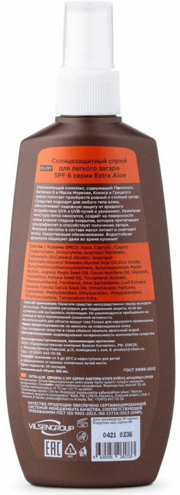 💳 Оплатить за товар можно при получении 🇰🇿 Есть бесплатная доставка по Казахстану от 1 дня 🎁 Копите бонусы с каждой покупки Серия: Extra Aloe Увлажняющий комплекс, содержащий пантенол, витамин Е, масла моркови, кокоса и ши помогает приобрести ровный и стойкий загар. Средство подходит для любого типа кожи, обеспечивает надежную защиту от вредного воздействия UVA и UVB-лучей. Создаёт на поверхности кожи ровное гладкое покрытие, которое притягивает ультрафиолет, и способствует получению загара. |
