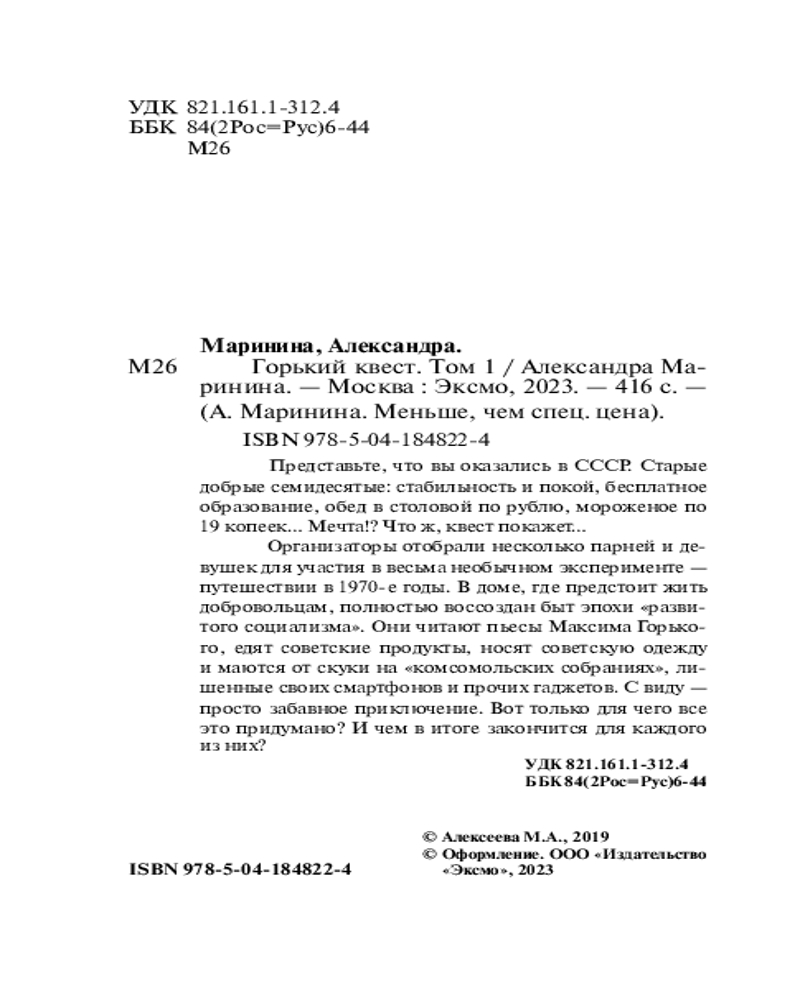 В данный момент этот товар отсутствует в продаже. Возможно, у нас найдется аналогичный или похожий товар здесь. Серия: А.Маринина. Меньше, чем спец.цена (обложка) Роман-квест. Роман-тест. Роман-переосмысление! «Горький квест» — это невероятный эксперимент по погружению современных молодых людей в советскую эпоху 70-х годов. Для написания этого произведения Александра Маринина организовала фокус-группы современной молодежи и их реальные реакции описала в книге. Вы узнаете, как повело бы себя поколение Z в реалиях эпохи «развитого социализма».