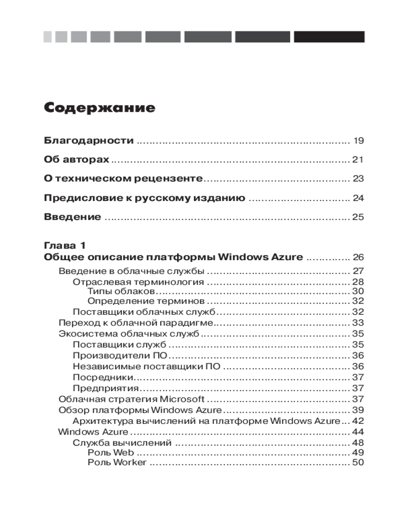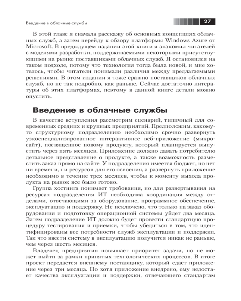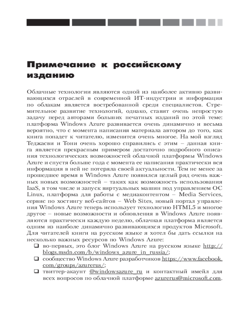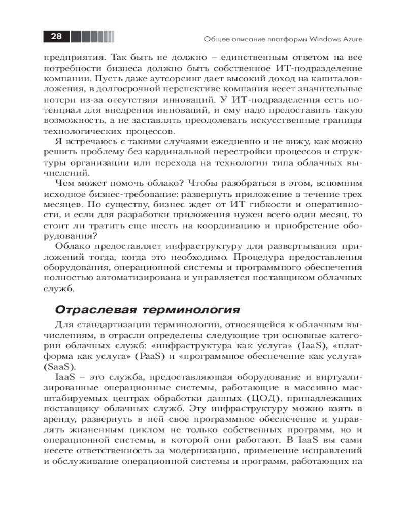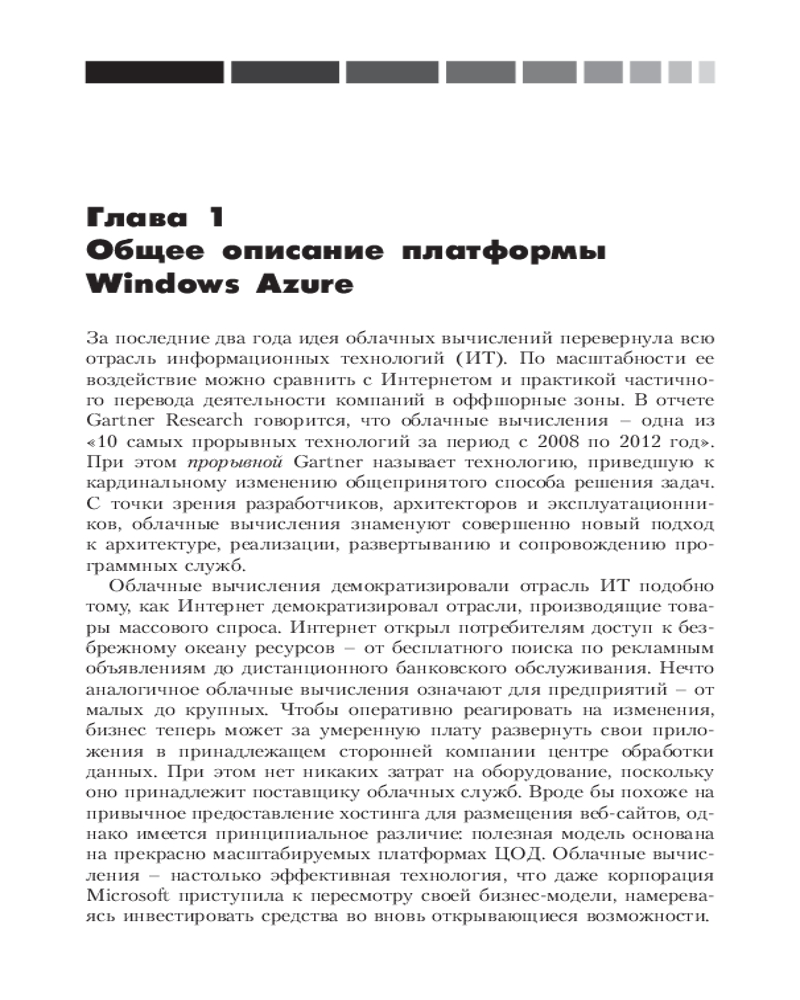 Платформа состоит из трех основных частей: собственно Windows Azure, Windows Azure AppFabric и SQL Azure. В этой книге на конкретных примерах показано, как использовать различные компоненты, по отдельности или вместе. Демонстрируются рекомендованные приемы интеграции этих технологий с существующими системами.