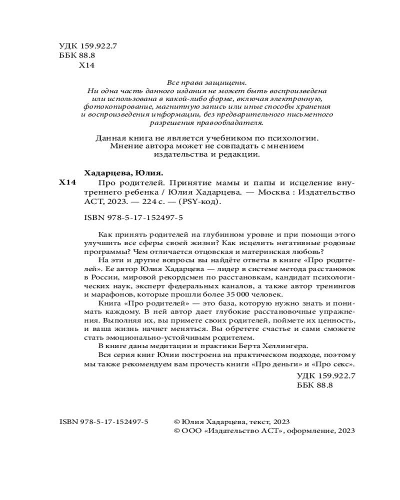 💳 Оплатить за товар можно при получении 🇰🇿 Есть бесплатная доставка по Казахстану от 1 дня 🎁 Копите бонусы с каждой покупки Серия: PSY-код Как принять родителей на глубинном уровне и при помощи этого улучшить все сферы своей жизни? Как исцелить негативные родовые программы? Чем отличается отцовская и материнская любовь? |
