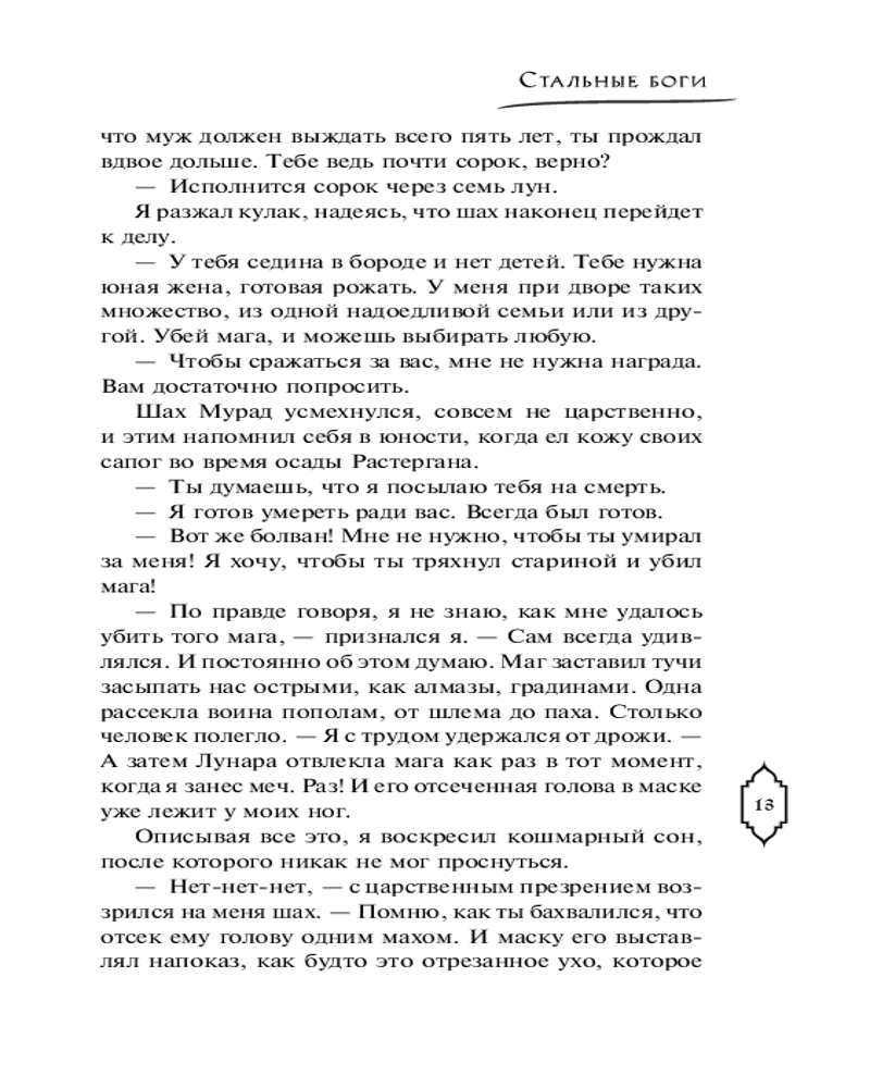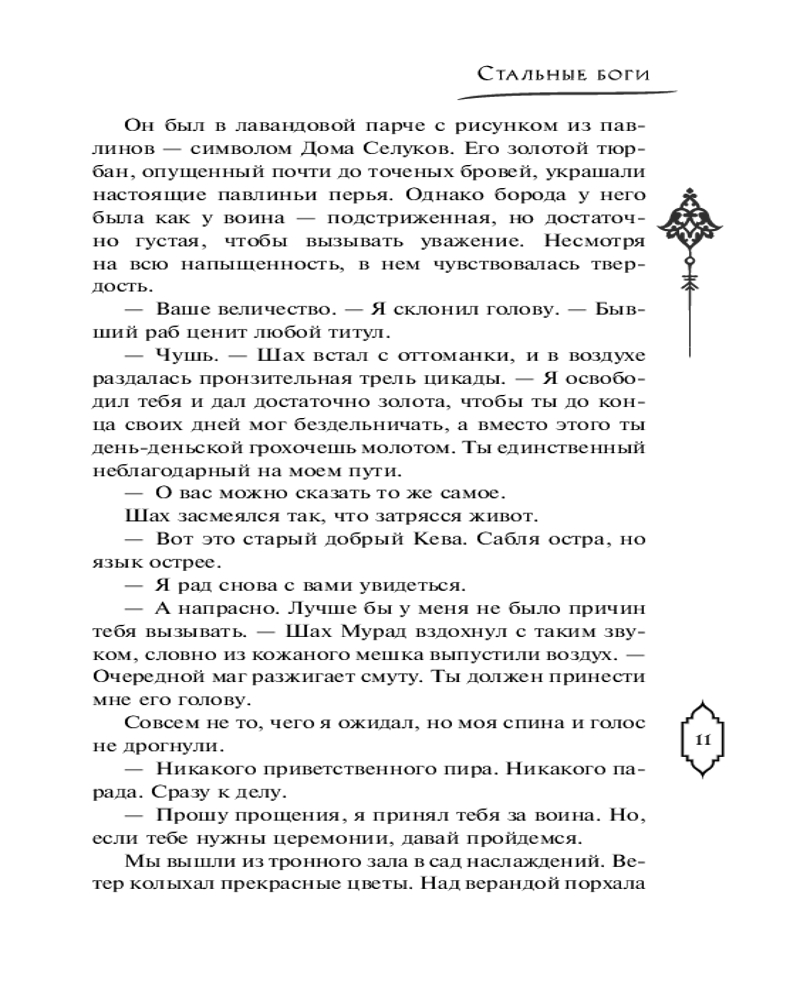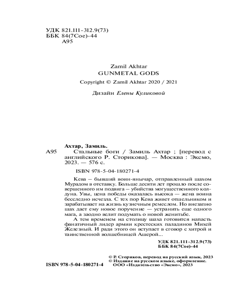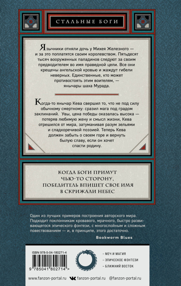 💳 Оплатить за товар можно при получении 🇰🇿 Есть бесплатная доставка по Казахстану от 1 дня 🎁 Копите бонусы с каждой покупки Серия: Fanzon. Наш выбор Когда боги примут чью-то сторону, победитель впишет свое имя в скрижали небес... Язычники отняли дочь у Михея Железного — и за это поплатятся своим королевством. Пятьдесят тысяч вооруженных паладинов следуют за своим предводителем во имя праведной цели. Они все крещены ангельской кровью и жаждут сожжения неверных. Только янычары могут противостоять паладинам. Ставший живой легендой янычар Кева однажды смог совершить то, что не под силу обычному смертному: он обезглавил мага под градом заклинаний, но потерял жену. С тех пор он отрешился от мира, затуманивая разум зельями и сладкоречивой поэзией. Чтобы спасти королевство, Кева должен забыть о своем горе и вернуть былую славу. Паладины Михея Железного уже близко, полные гнева и решимости писать собственную легенду — кровью. |