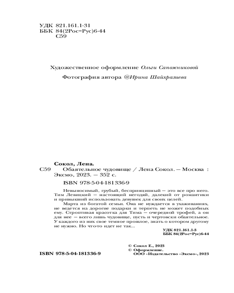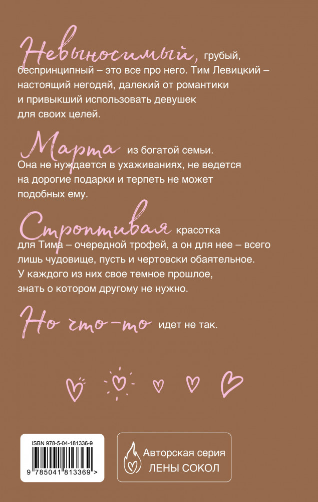Обаятельное чудовищеВ данный момент этот товар отсутствует в продаже. Возможно, у нас найдется аналогичный или похожий товар здесь. Серия: Романтика Лены Сокол Второстепенный персонаж Тим Левицкий из романов «Разрешите влюбиться» и «С тобой? Никогда!» наконец становится главным героем. Лена Сокол раскрывает все тайны Тима, подробно рассказывая историю его знакомства с удивительной и дерзкой Мартой Кауффман. По нелепой случайности они должны вместе управлять ночным клубом «IDOL». Марта поставит беспринципного наглого парня на место и покажет, на что способны девушки. И однажды Тим растает. Но сможет ли он примириться с темным прошлым Марты? Или даже такие обаятельные чудовища, как он, отворачиваются от этой смелой девушки, когда узнают ее историю? |
