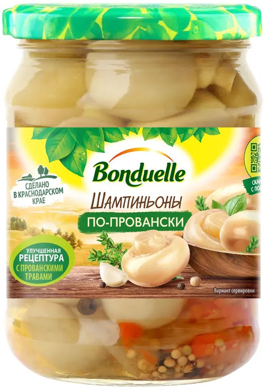 Bonduelle Шампиньоны маринованные «По-провански»В данный момент этот товар отсутствует в продаже. Возможно, у нас найдется аналогичный или похожий товар здесь. «Шампиньоны по-провански» — это вкус юга Франции, который стал намного ярче. Круглые, золотистые, один к одному грибы в ароматном маринаде теперь производят на заводе Bonduelle в Краснодарском крае по улучшенной рецептуре. Натуральный аромат прованских трав и вкус красного болгарского перца чувствуется более отчетливо, так как значительно уменьшили количество кислот и сахара. Все это сделало грибы намного полезнее! Открываете банку и вуаля — на столе готовая пикантная закуска. Без всяких хлопот! |