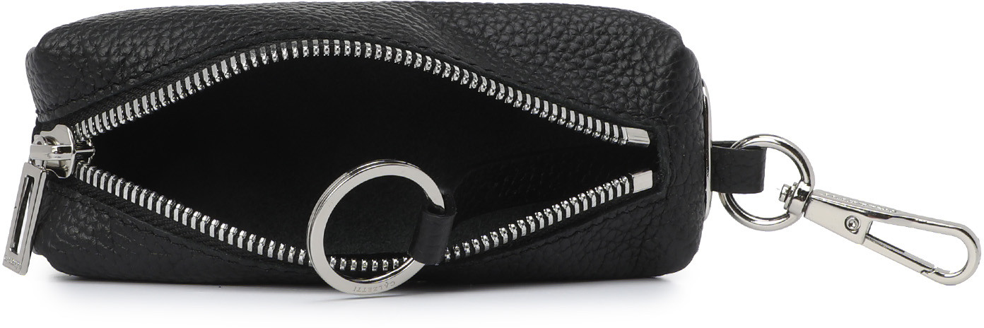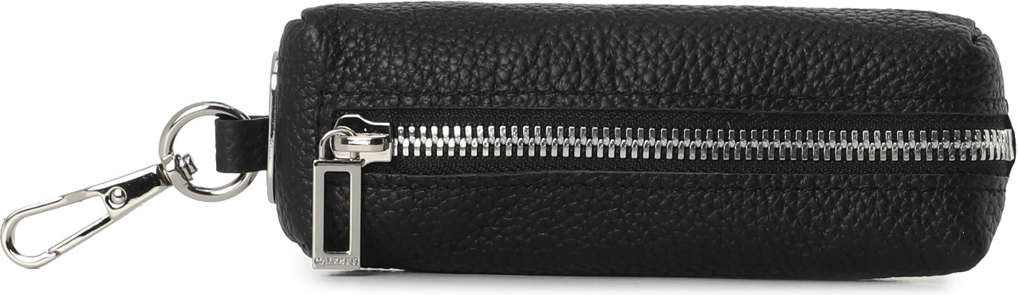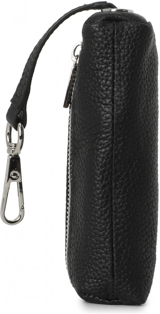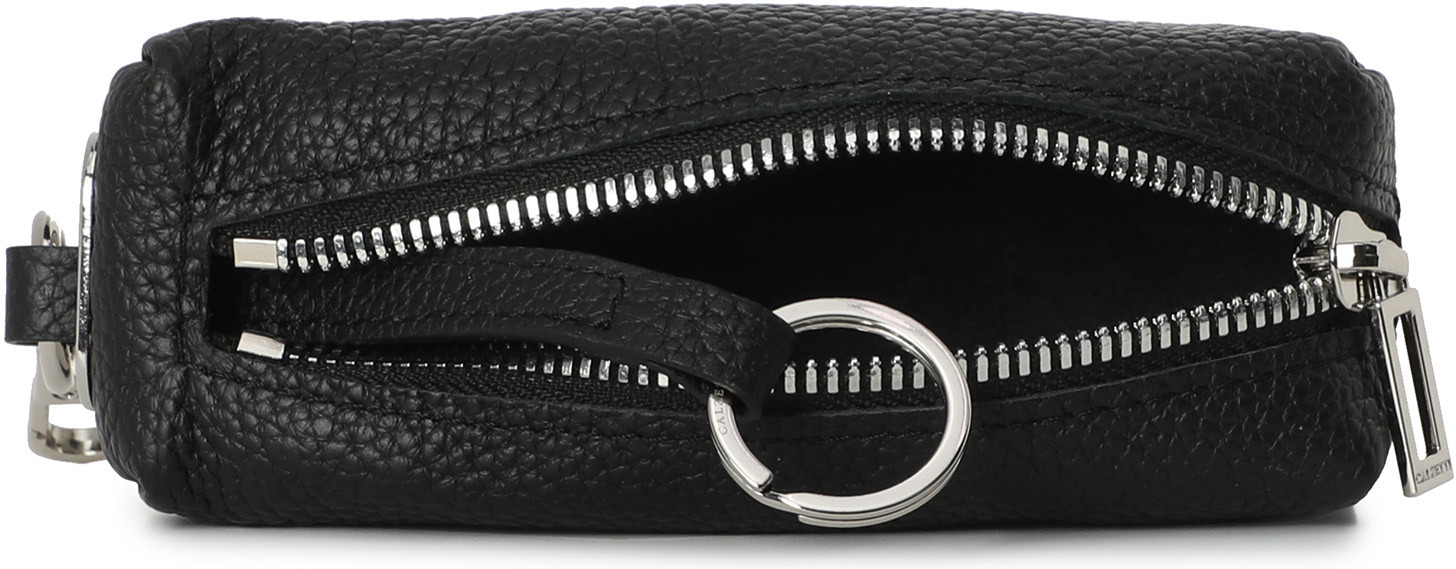 Удобный и стильный аксессуар для хранения ключей. Футляр для ключей выполнен из натуральной кожи теленка, фактура — зернистая, без подкладки. Основное отделение закрывается на молнию, внутри — кольцо-держатель для ключей.