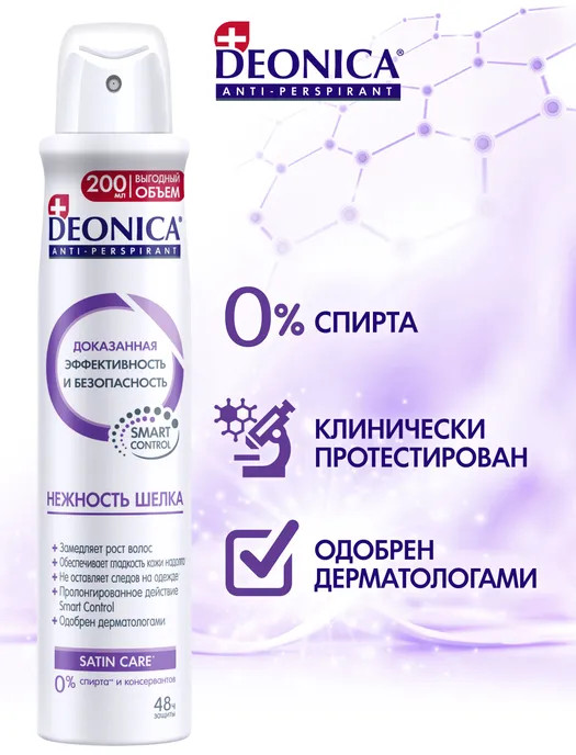Deonica Антиперспирант спрей «Нежность шелка»-25% +42 защита надолго тонкий аромат любимый запах недостаточная эффективность