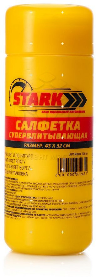 Stark Салфетка для автомобиля супервпитывающаяВ данный момент этот товар отсутствует в продаже. Возможно, у нас найдется аналогичный или похожий товар здесь. Салфетка супервпитывающая в тубе предназначена для ухода за салоном автомобиля. Пропитка изделия специальным абсорбирующим составом является запатентованной технологией производителя. По своим возможностям изделие превосходит аналоги из микрофибры в 2 раза, а из искусственной замши — в 4 раза. |