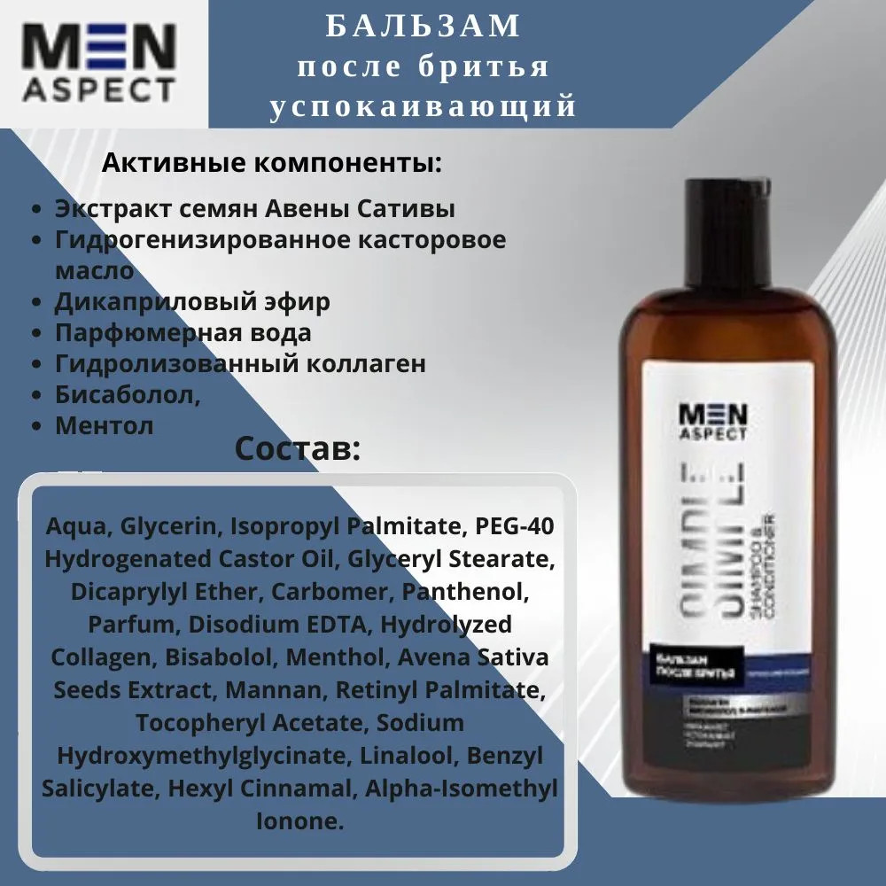 💳 Оплатить за товар можно при получении 🇰🇿 Есть бесплатная доставка по Казахстану от 1 дня 🎁 Копите бонусы с каждой покупки Серия: Men Aspect Simple Бальзам содержит ряд активных компонентов, которые успокаивают и увлажняют кожу. Коллаген восстанавливает повреждённую структуру белка кожи, D-пантенол и бисаболол устраняют сухость и шелушение. Бальзам после бритья защищает кожу и предотвращает раздражение после процедуры бритья. |