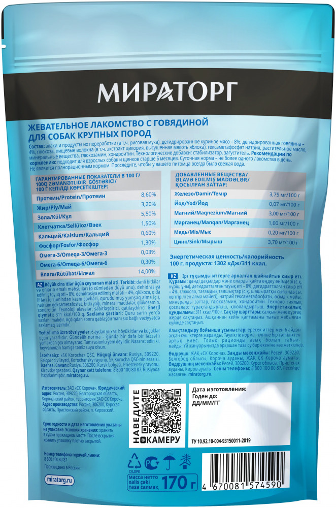 Мираторг Лакомство для собак средних пород жевательное с говядиной+60 приятный вкус