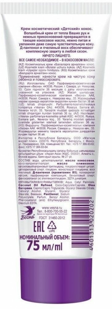 Весна Крем детский с кокосовым масломВ данный момент этот товар отсутствует в продаже. Возможно, у нас найдется аналогичный или похожий товар здесь. Крем косметический Детский кокос. Волшебный крем от тепла Ваших рук и нежных прикосновений превращается в тающее кокосовое масло, нежно питая и увлажняя даже самую чувствительную кожу. Д-пантенол и пчелиный воск обеспечивают комплексную защиту в любой сезон. Ничего лишнего, все самое необходимое — в кокосовом масле! |