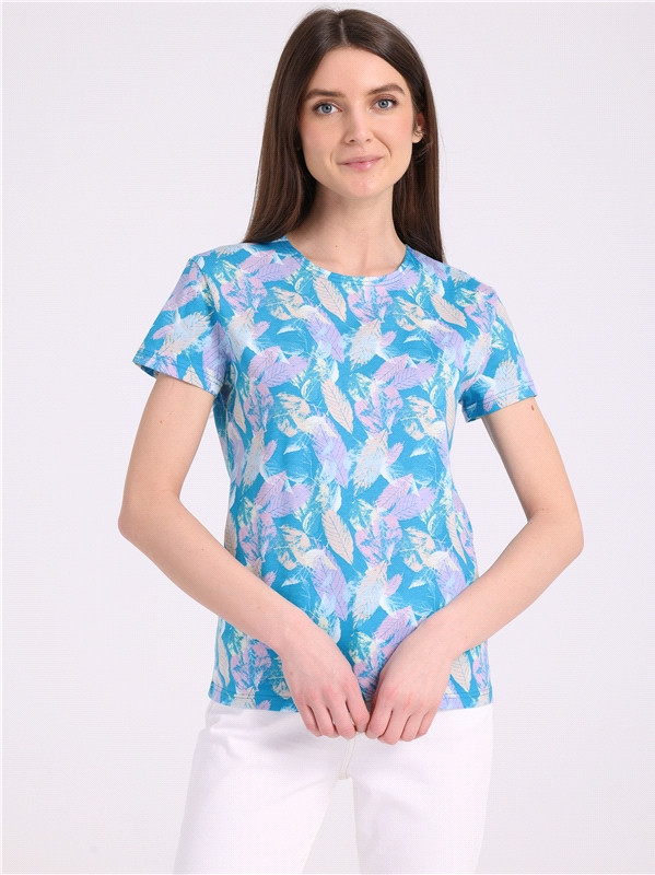 Футболка выполнена из кулира — легкого хлопкового полотна. Изделие свободного покроя с короткими рукавами и округлым вырезом горловины.
