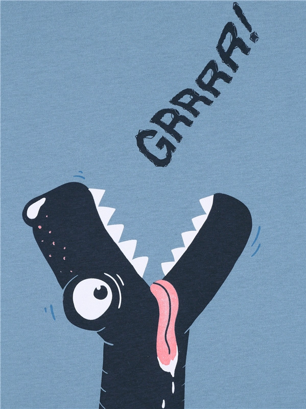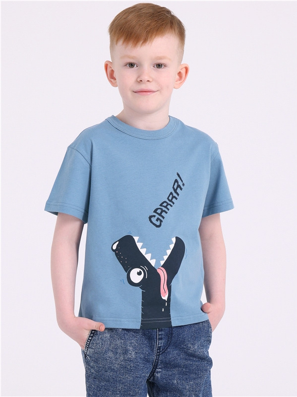Футболка для мальчика выполнена из кулира — легкого хлопкового плотна. Изделие прямого силуэта и свободного кроя, с короткими рукавами со спущенной линией плеча, вырез горловины обработан эластичной бейкой из полотна компаньона. Футболка украшена ярким стильным принтом.