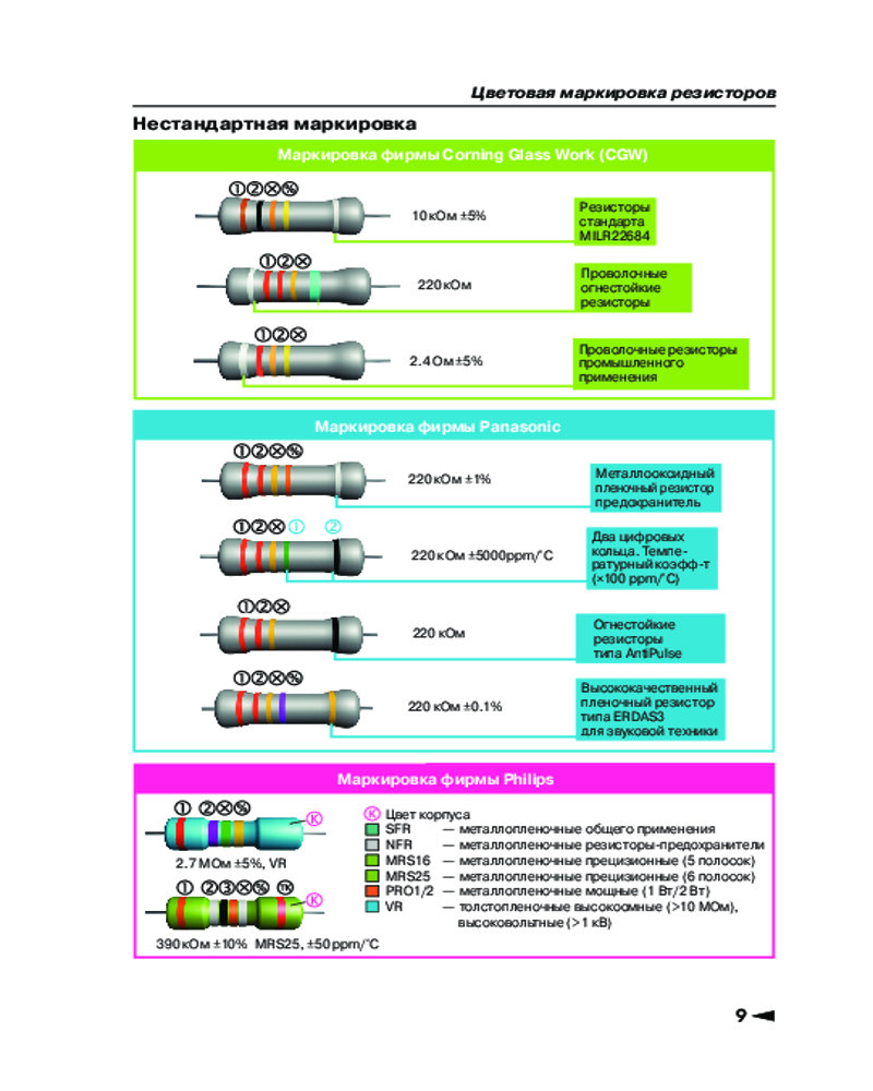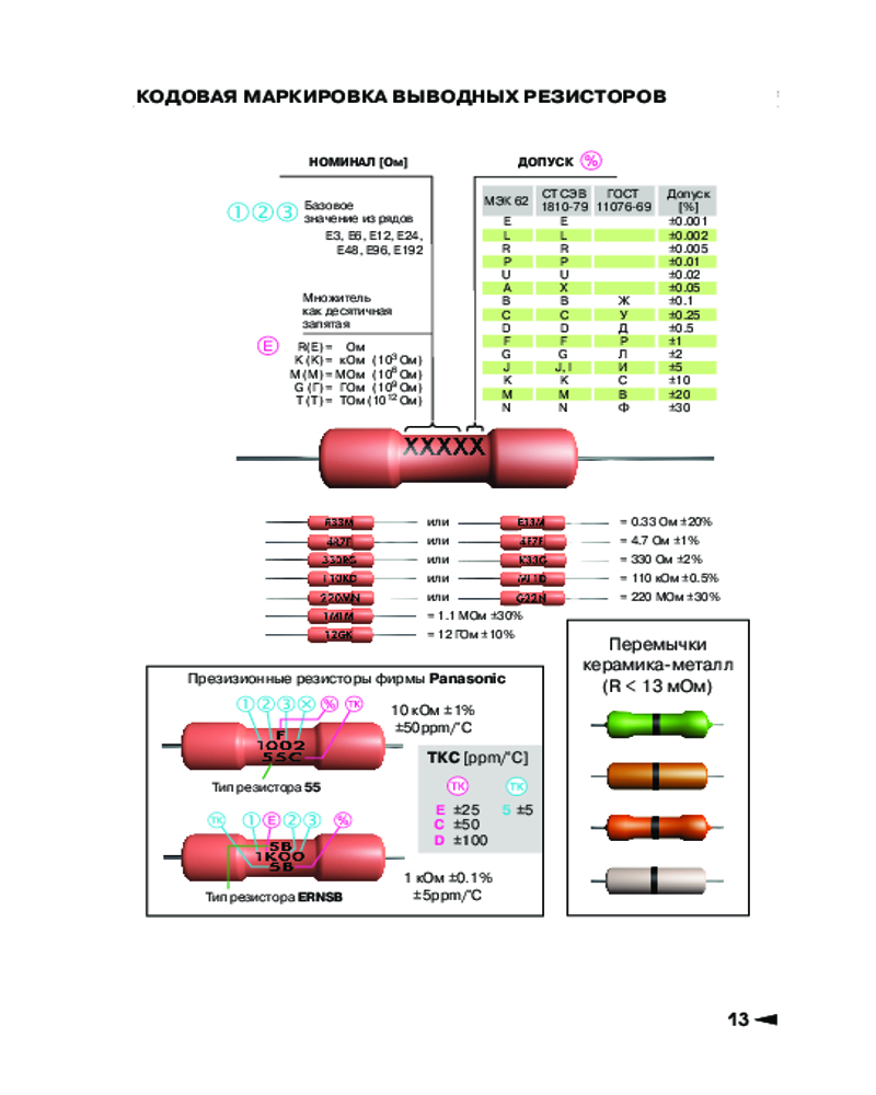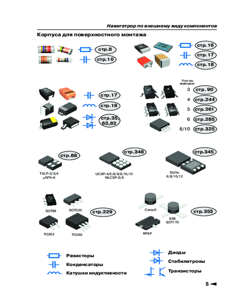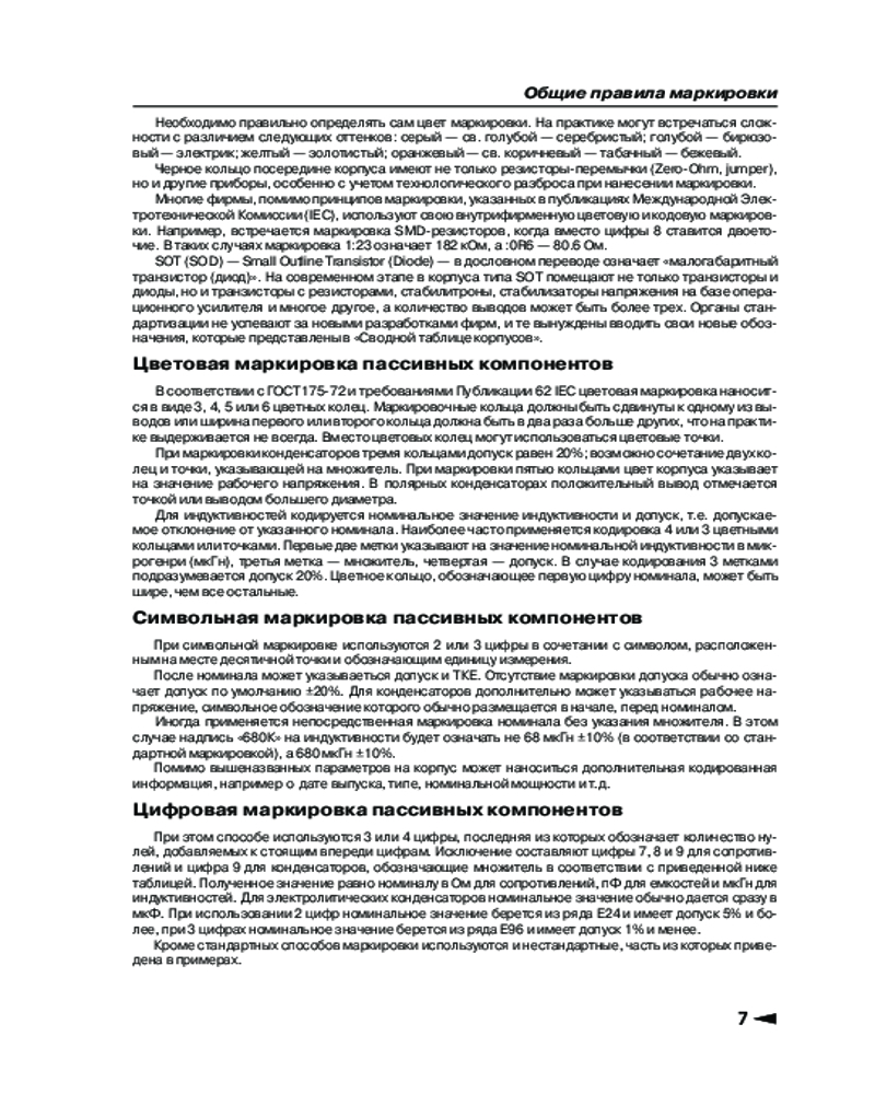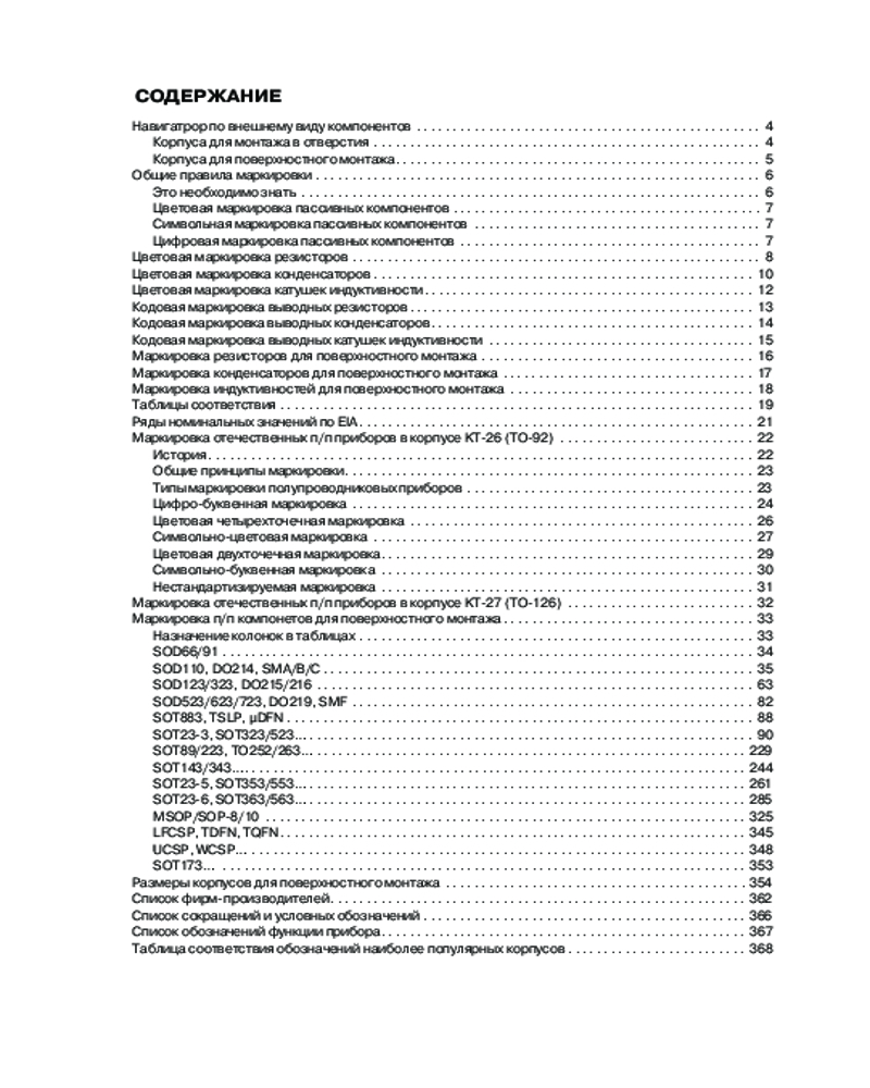В главах, посвященным пассивным компонентам, рассмотрены принципы цветовой и кодовой маркировки резисторов, конденсаторов, катушек индуктивности и других элементов по номиналу, допускам и другим параметрам, а также нестандартная маркировка компонентов некоторых ведущих фирм-производителей.