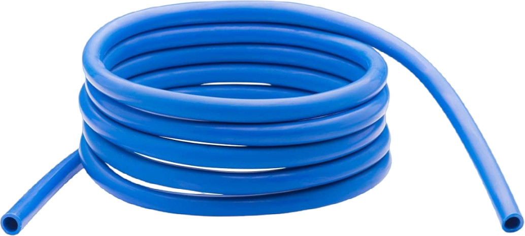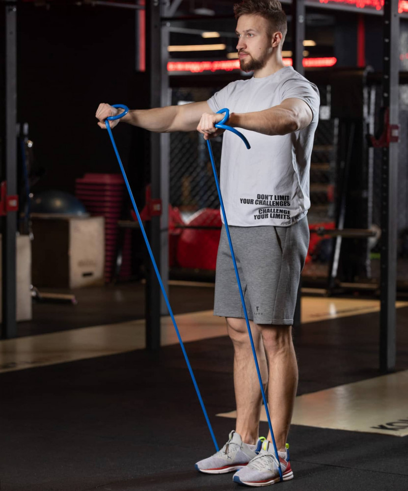 Эспандер синего цвета имеет минимальную степень нагрузки и подойдет тем, кто только начал заниматься с подобными резиновыми трубками.