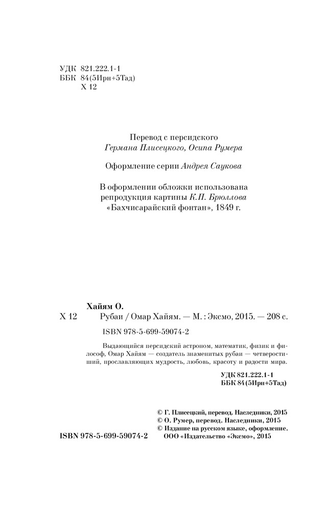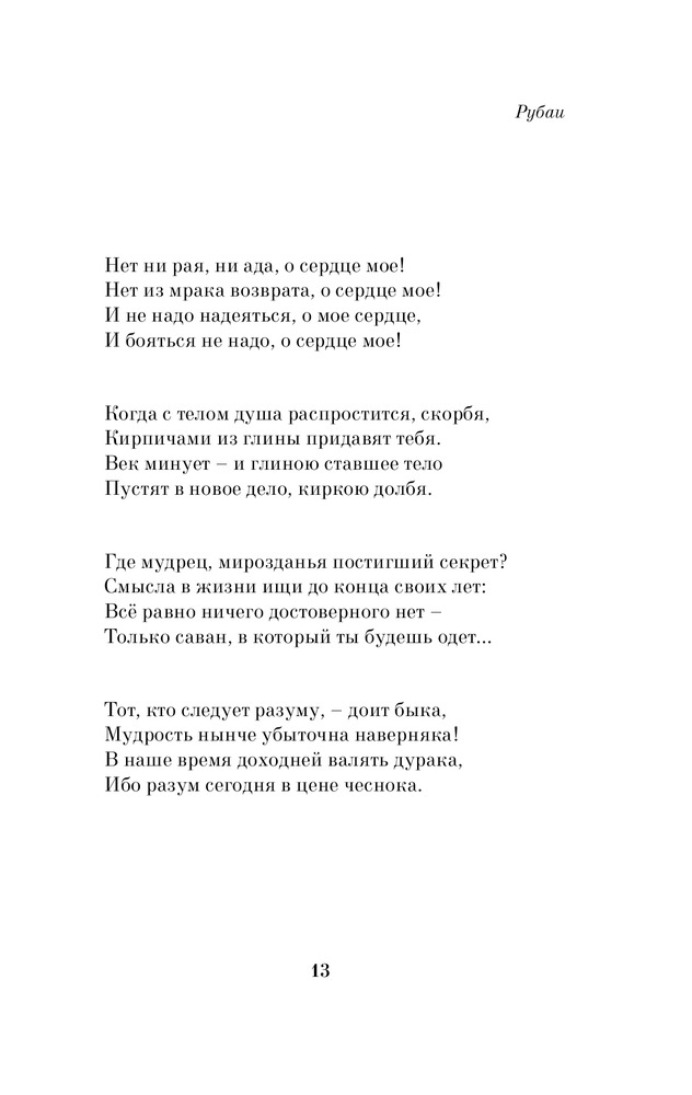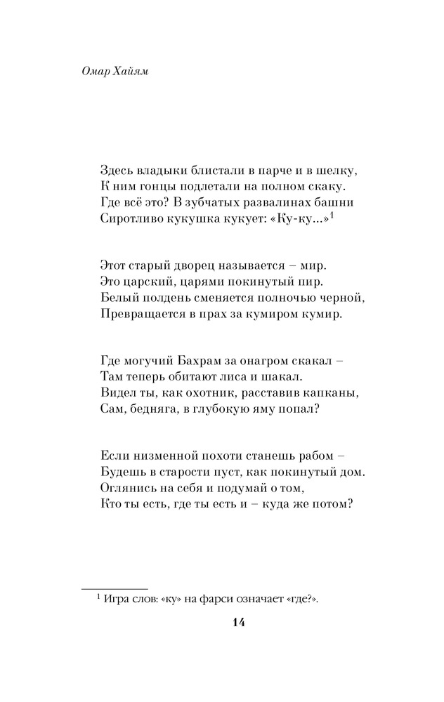💳 Оплатить за товар можно при получении 🇰🇿 Есть бесплатная доставка по Казахстану от 1 дня 🎁 Копите бонусы с каждой покупки Серия: Pocket Book (обложка) Выдающийся персидский астроном, математик, физик и философ, Омар Хайям — создатель знаменитых рубаи — четверостиший, прославляющих мудрость, любовь, красоту и радости мира. |
