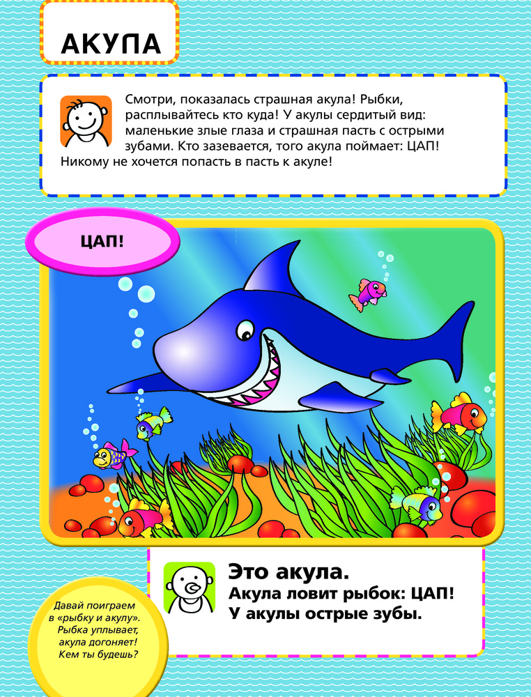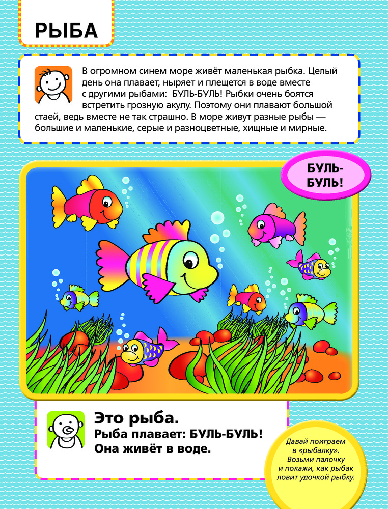 Отлично в книге показаны рыбки, медуза, дельфин и т.д. интересно и увлекательно! Что самое хорошее, то что книга от года, но содержит 2 вида текста для детей от 1 и страше 1,5, что очень помогает развивать речь. Покупайте!