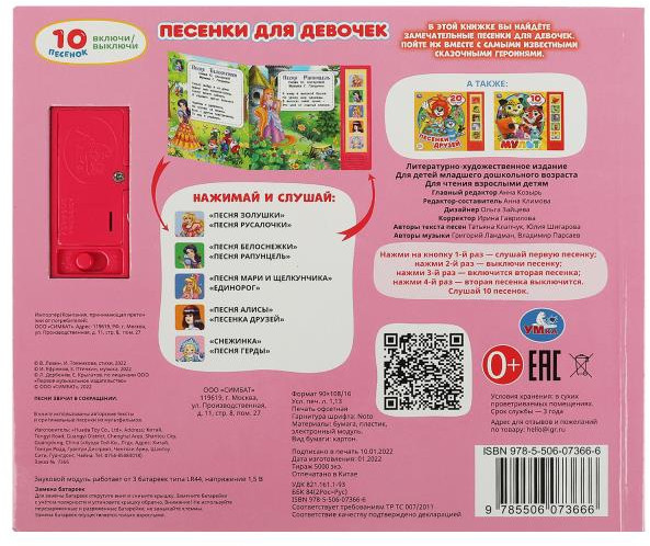 💳 Оплатить за товар можно при получении 🇰🇿 Есть бесплатная доставка по Казахстану от 1 дня 🎁 Копите бонусы с каждой покупки Серия: Музыкальная книжка Музыкальная книга «Союзмультфильм. Песенки для девочек» ТМ «УМка» станет отличным подарком для маленькой принцессы: |