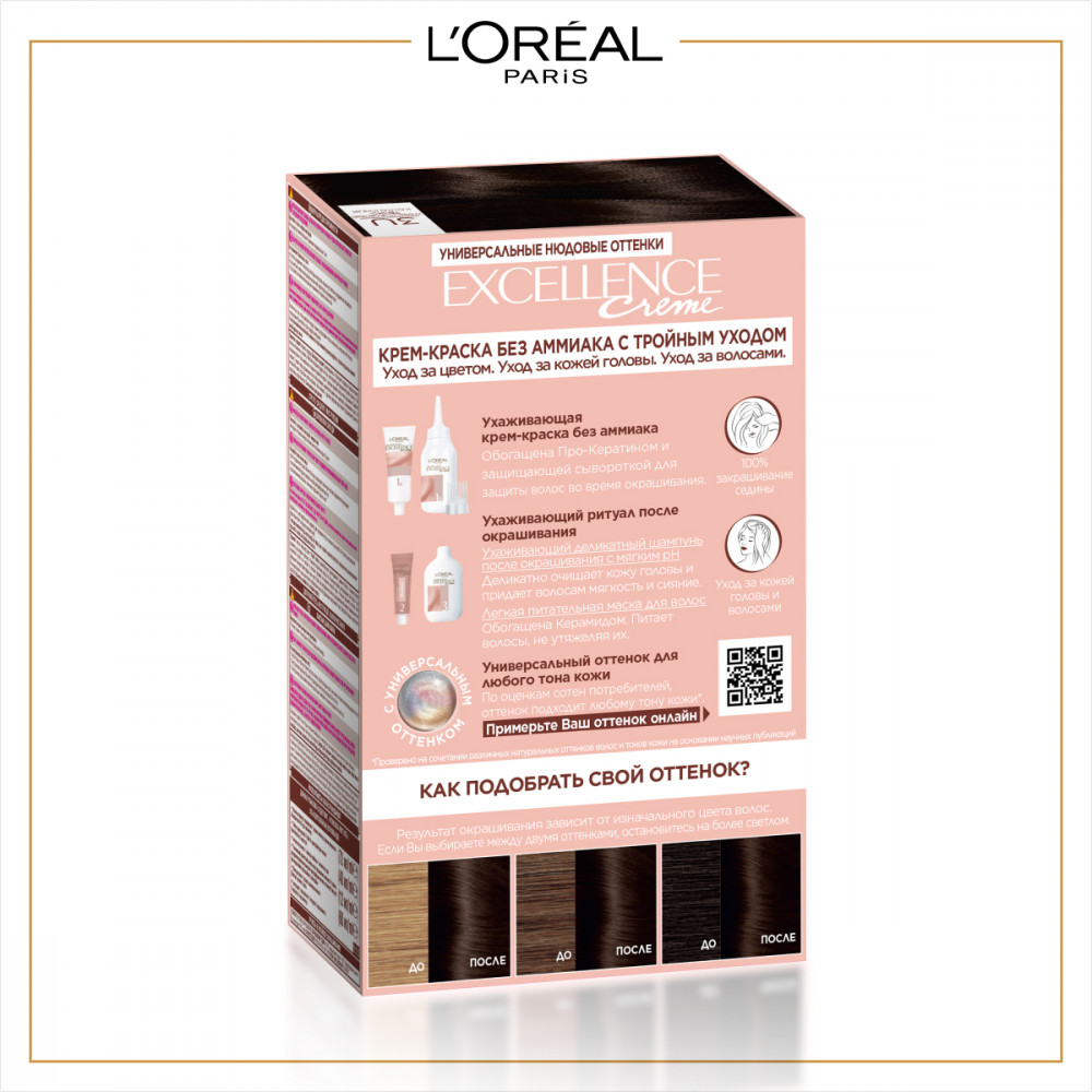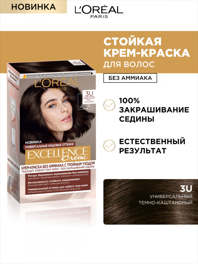 L'Oreal Paris Крем-краска для волос cтойкая «Excellence», оттенок 3U универсальный темно-каштановый