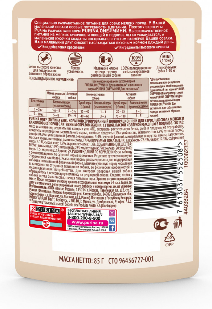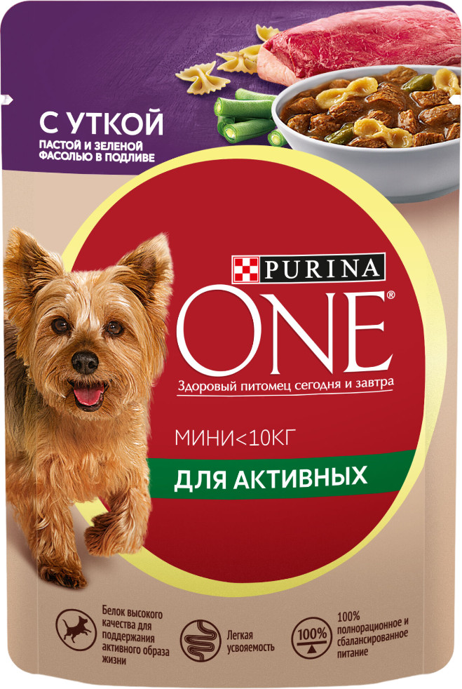 Purina ONE Корм для активных собак малых пород с уткой, пастой и зелёной фасолью в подливе