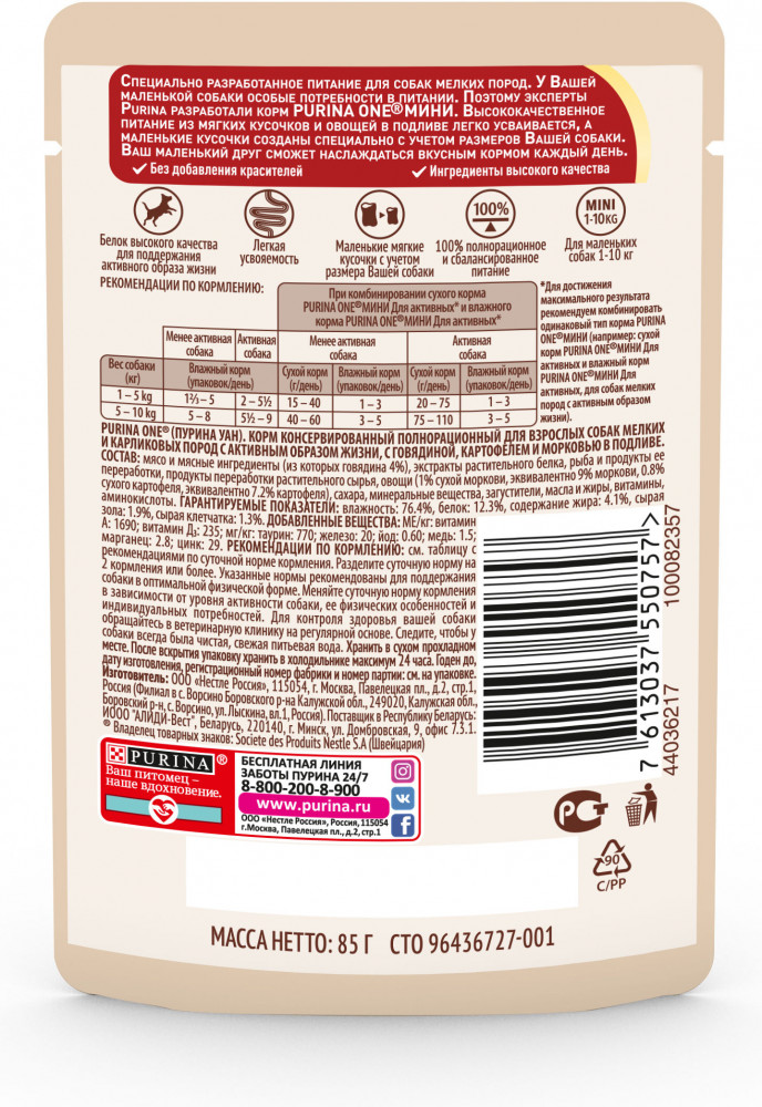 Purina ONE Корм для активных собак малых пород с говядиной, картофелем и морковью в подливе