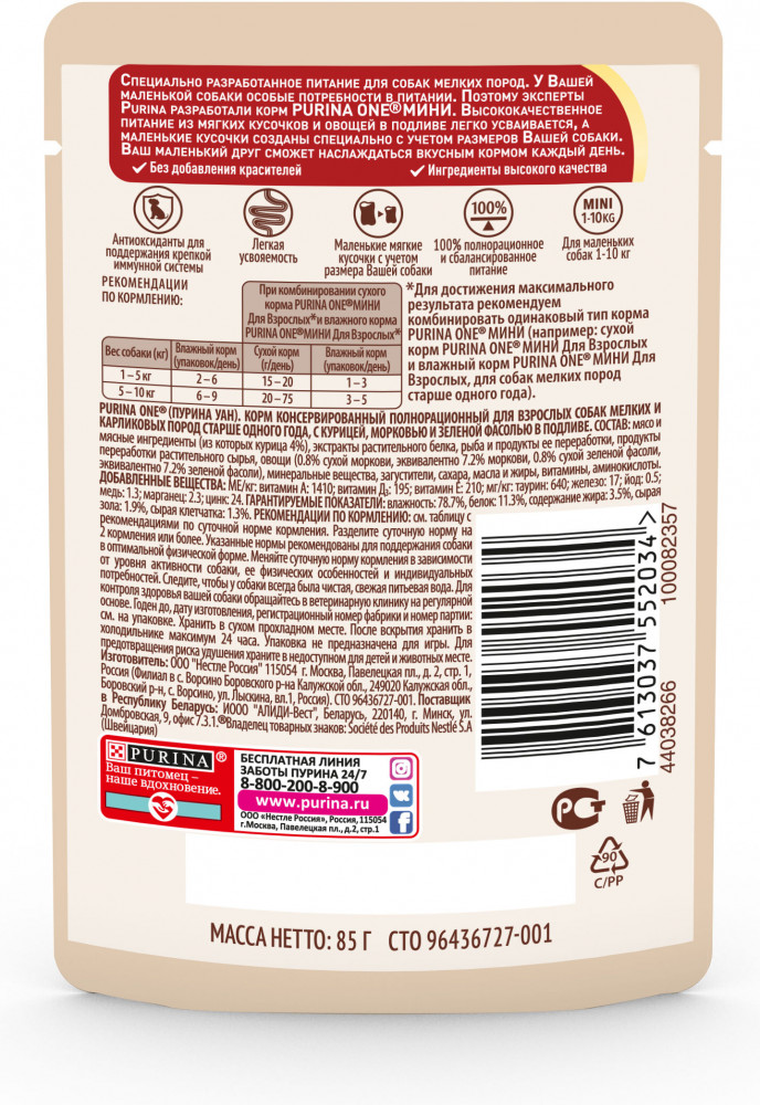 Purina ONE Корм для взрослых собак малых пород с курицей, морковью и зеленой фасолью в подливе