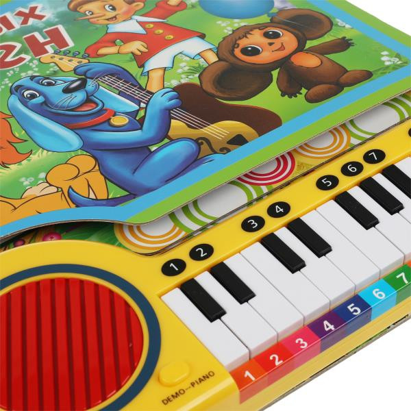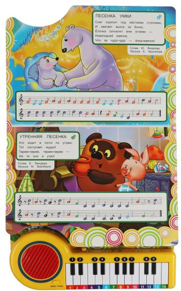 На каждой страничке это занимательной книги ребёнка ждут красивые иллюстрации с текстом песен и нотами к ним. При нажатии на кнопку слева от клавиш происходит переключение на режим проигрывания песен, при втором нажатии — переключение на пианино. В режиме пианино маленький музыкант, нажимая на клавиши, сможет наиграть по нотам-подсказкам песенки из книги или придумать свои собственные мелодии. Книга сделана из плотного картона, поэтому мамы могут не опасаться, что ребёнок порвёт странички.