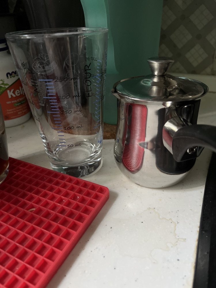 Измерила объем, но 360 мл воды не помещаются, если только еще отдельно в крышку налить воду. На фото турка стоит рядом с кружкой объемом 250 мл, а на втором фото рядом с мерным стаканом, где видна метка 250 мл