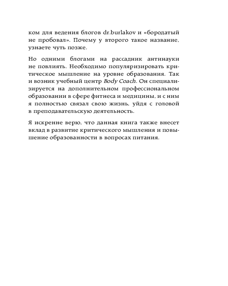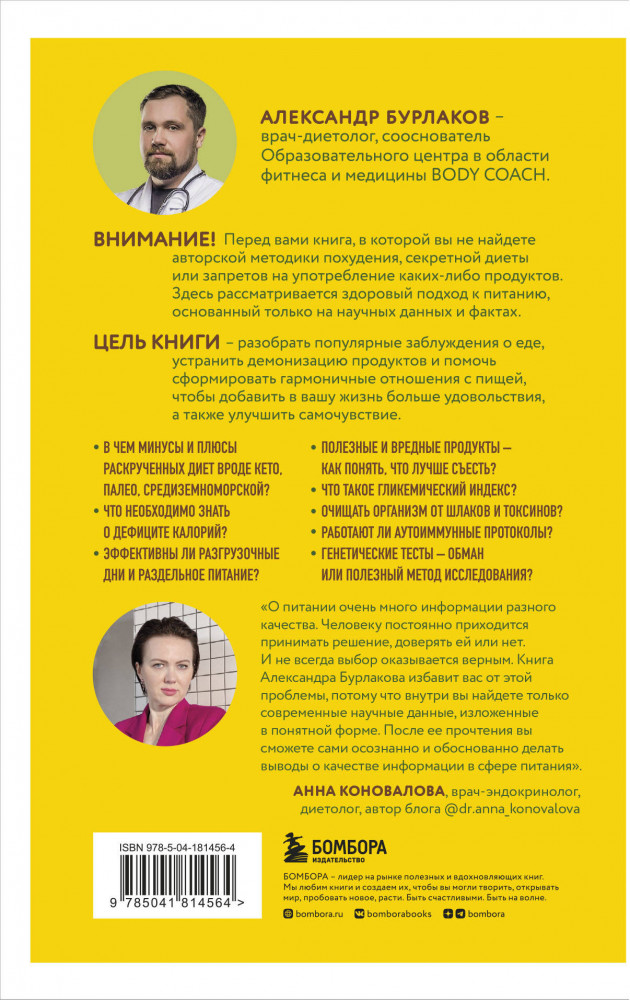 «О питании очень много информации разного качества. Человеку постоянно приходится принимать решение, доверять ей или нет. И не всегда выбор оказывается верным. Книга Александра Бурлакова избавит вас от этой проблемы, потому что внутри вы найдете только современные научные данные, изложенные в понятной форме. После ее прочтения вы сможете сами осознанно и обоснованно делать выводы о качестве информации в сфере питания». — Анна Коновалова, врач-эндокринолог, диетолог, преподаватель Образовательного центра в области фитнеса и медицины Body Coach, автор блога @dr.anna_konovalova |