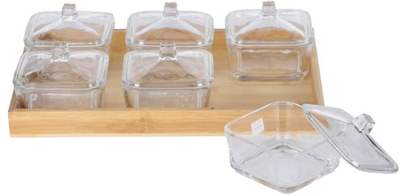 Qing Ping Guo Менажница с крышкамиВ данный момент этот товар отсутствует в продаже. Возможно, у нас найдется аналогичный или похожий товар здесь. Менажница шестисекционная на деревянной подставке. Прекрасно подходит для сервировки орешков, закусок, оливок, сладостей и украсит любой стол. Чаши, как и подставку, можно использовать отдельно для подачи блюд. Универсальная посуда для сервировки. Размер пиалы: 10,3 × 10,2 × 4,7 см. Объём пиалы: 195 мл. |