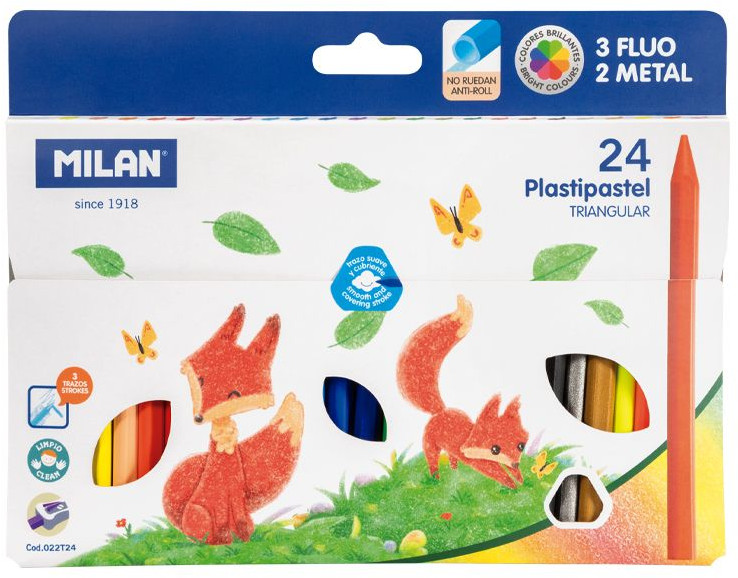Milan Набор карандашей пластиковых «Plastipastel»В данный момент этот товар отсутствует в продаже. Возможно, у нас найдется аналогичный или похожий товар здесь. Набор цветных карандашей содержит 24 карандаша из пластика, в том числе 3 флуоресцентных цвета и 2 металлических.. Трехгранная форма с закругленными краями идеально ложатся в руки и предотвращают перекатывание карандашей по рабочей поверхности. Яркие литые пластиковые карандаши не пачкают руки и не имеют запаха, обладают высокой стойкостью к поломке и идеально подходят детям. Если рисовать кончиком карандаша, то получаются тонкие линии; если обратной стороной - толстые; обширные области можно закрашивать, используя карандаш по всей длине. |
