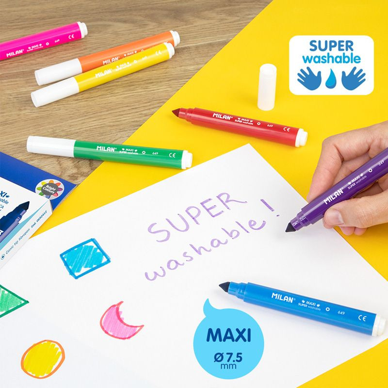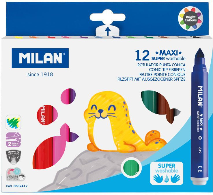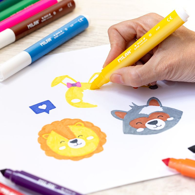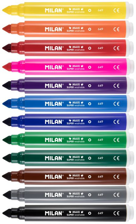 Milan Набор фломастеров «Maxi»В данный момент этот товар отсутствует в продаже. Возможно, у нас найдется аналогичный или похожий товар здесь. Фломастеры с чернилами на водной основе для детского творчества, легко смываются с рук, мебели, одежды (замочите изделие на час в холодной воде, а затем постирайте в машине при низкой температуре). Идеально подходят для детского творчества. Увеличенный диаметр корпуса фломастеров серии «Maxi» и толстый наконечник идеальны для самых маленьких. Яркие цвета легко смешиваются друг с другом, позволяя создавать новые оттенки |