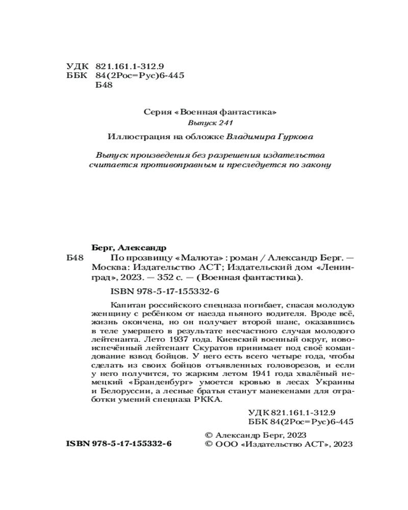 💳 Оплатить за товар можно при получении 🇰🇿 Есть бесплатная доставка по Казахстану от 1 дня 🎁 Копите бонусы с каждой покупки Серия: Военная фантастика Капитан российского спецназа погибает, спасая молодую женщину с ребёнком от наезда пьяного водителя. Вроде всё, жизнь окончена, но он получает второй шанс, оказавшись в теле умершего в результате несчастного случая молодого лейтенанта. Лето 1937 года. Киевский военный округ, новоиспечённый лейтенант Скуратов принимает под своё командование взвод бойцов. У него есть всего четыре года, чтобы сделать из своих бойцов отъявленных головорезов, и если у него получится, то жарким летом 1941 года хвалёный немецкий «Бранденбург» умоется кровью в лесах Украины и Белоруссии, а лесные братья станут манекенами для отработки умений спецназа РККА. |