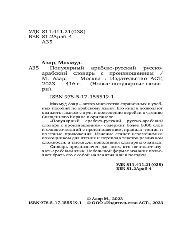 Популярный арабско-русский русско-арабский словарь с произношениемВ данный момент этот товар отсутствует в продаже. Возможно, у нас найдется аналогичный или похожий товар здесь. Серия: Новые популярные словари Махмуд Азар — автор множества справочных и учебных пособий по арабскому языку. Его книги позволяют овладеть языком с нуля и постепенно перейти к чтению Священного Корана в оригинале. |