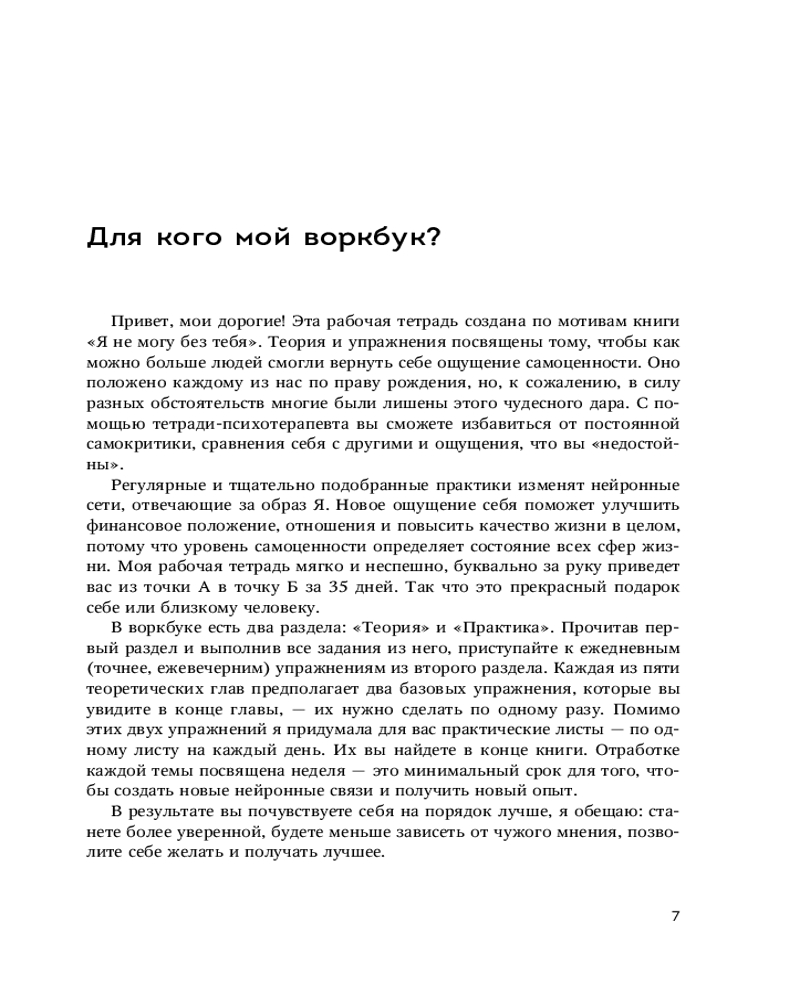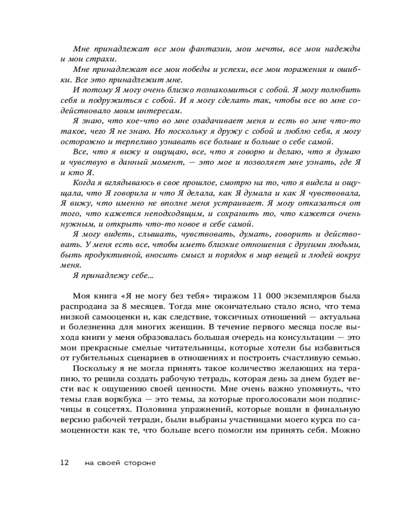 «Ключевое в работе над самоценностью — это наработка привычки думать о себе по-другому. Необходимо осмелиться вырасти из тесных штанишек сковывающих убеждений и вернуть себе свободу самой выбирать, какой быть и во что верить. Именно это и помогает сделать данный воркбук, задавая правильные вопросы и приглашая к важным размышлениям, вдохновляющим на перемены». — Ольга Примаченко, автор бестселлера «К себе нежно»