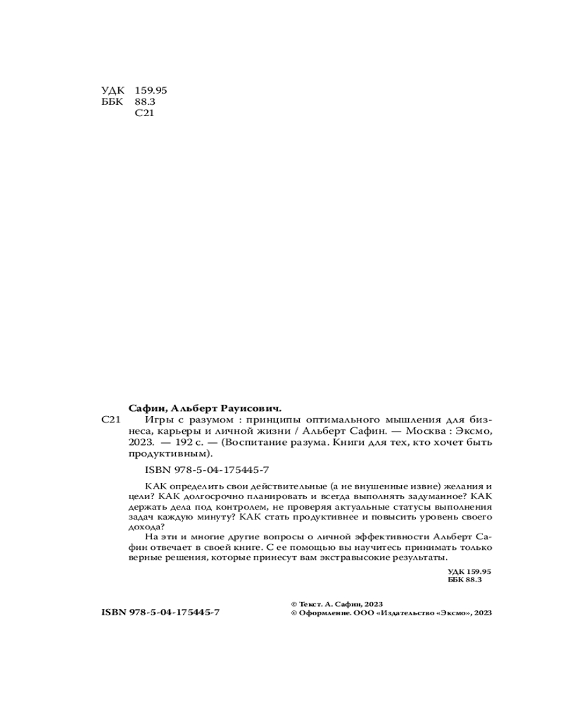 💳 Оплатить за товар можно при получении 🇰🇿 Есть бесплатная доставка по Казахстану от 1 дня 🎁 Копите бонусы с каждой покупки Серия: Воспитание разума. Книги для тех, кто хочет быть продуктивным Альберт Сафин — психолог, сертифицированный коуч, бизнес-тренер и лектор, которого смотрят 340 тысяч подписчиков на Ютубе. И это число постоянно растет. В книге «Игры с разумом» он учит развивать самый важный навык современного успешного человека — навык стратегического мышления. |