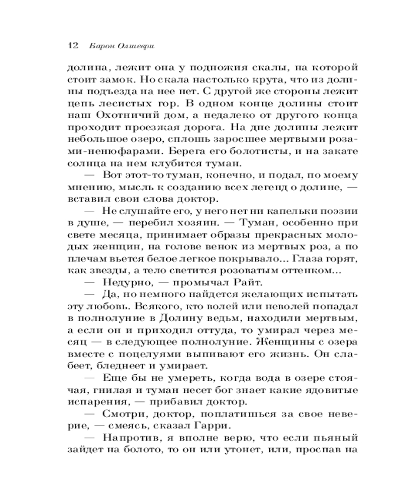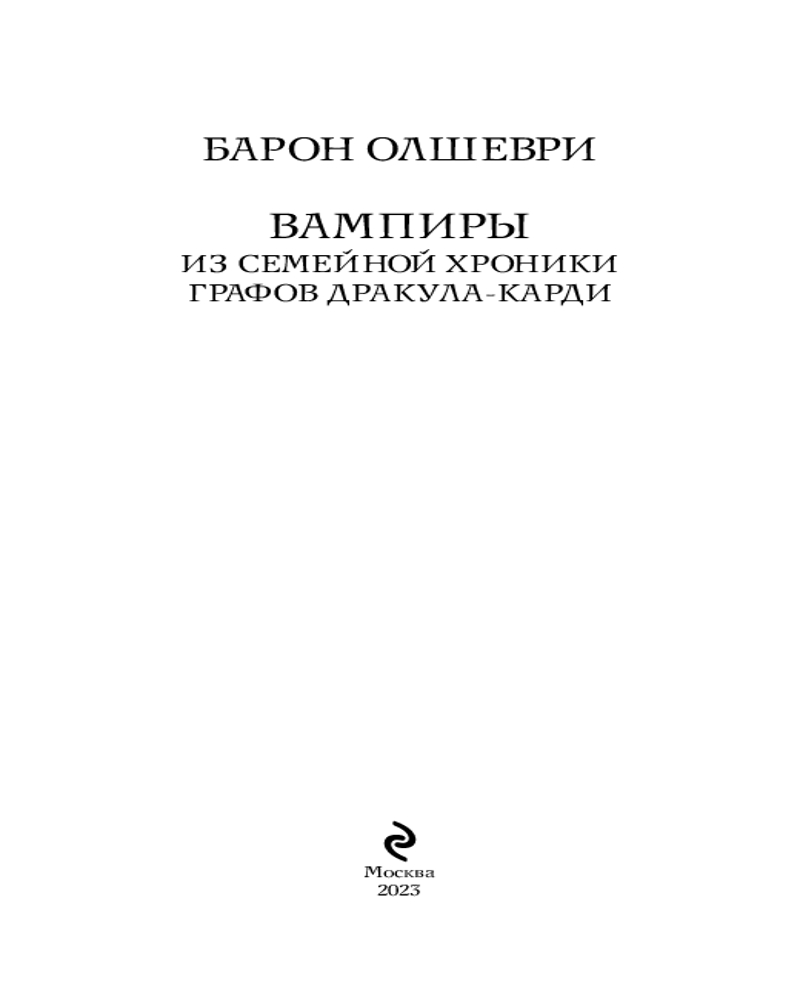 | Барон Олшеври - псевдоним русского автора, написавшего роман «Вампиры», который сюжетно является предысторией классической книги Брэма Стокера «Граф Дракула». Доподлинно об авторе ничего не известно, но имеются три версии того, кто скрывался за псевдонимом «Барон Олшеври», или, как было принято написание титулов в то время – «Б. Олшеври». По первой версии, автором романа является женщина, имя которой не указано, а фамилия – Мочанова-Хомзе. Будучи состоятельной дамой, имея в родстве... |