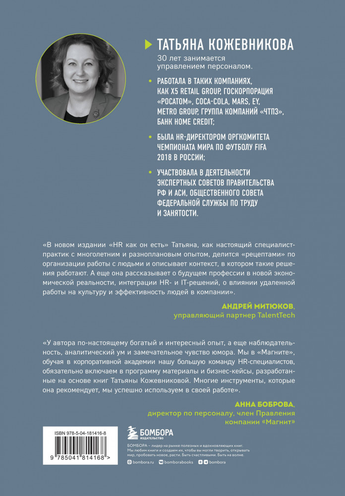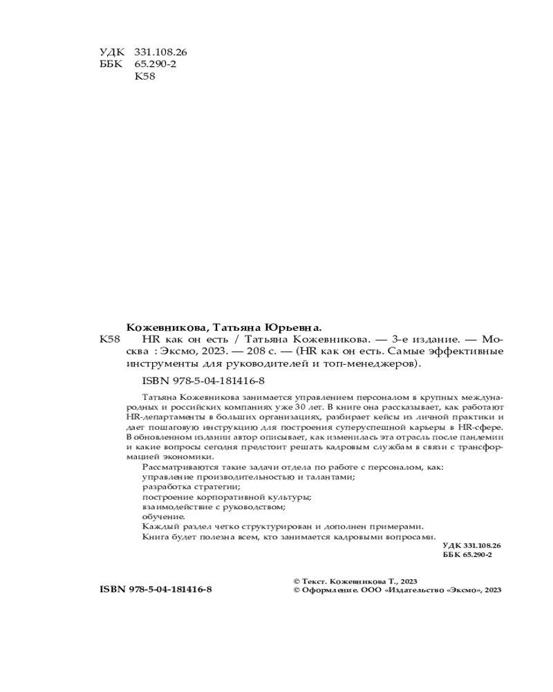 💳 Оплатить за товар можно при получении 🇰🇿 Есть бесплатная доставка по Казахстану от 1 дня 🎁 Копите бонусы с каждой покупки Серия: HR как он есть Татьяна Кожевникова занимается управлением персоналом в крупных международных и российских компаниях уже 30 лет. В книге она рассказывает, как работают HR-департаменты в больших организациях, разбирает кейсы из личной практики и дает пошаговую инструкцию для построения суперуспешной карьеры в HR-сфере. В обновленном издании автор описывает, как изменилась эта отрасль после пандемии и какие вопросы сегодня предстоит решать кадровым службам в связи с трансформацией экономики. |