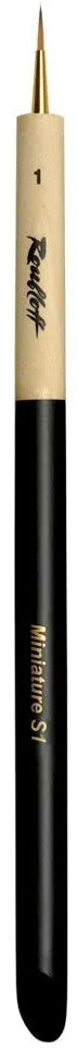 «Miniature S1 № 1» — круглая кисть с укороченной выставкой из синтетики имитации колонка для росписи миниатюр и окрашивания сборных моделей, оптимальна для техники филиграни и точечных рисунков, идеально разгружает напряжение с руки при работе с миниатюрой.