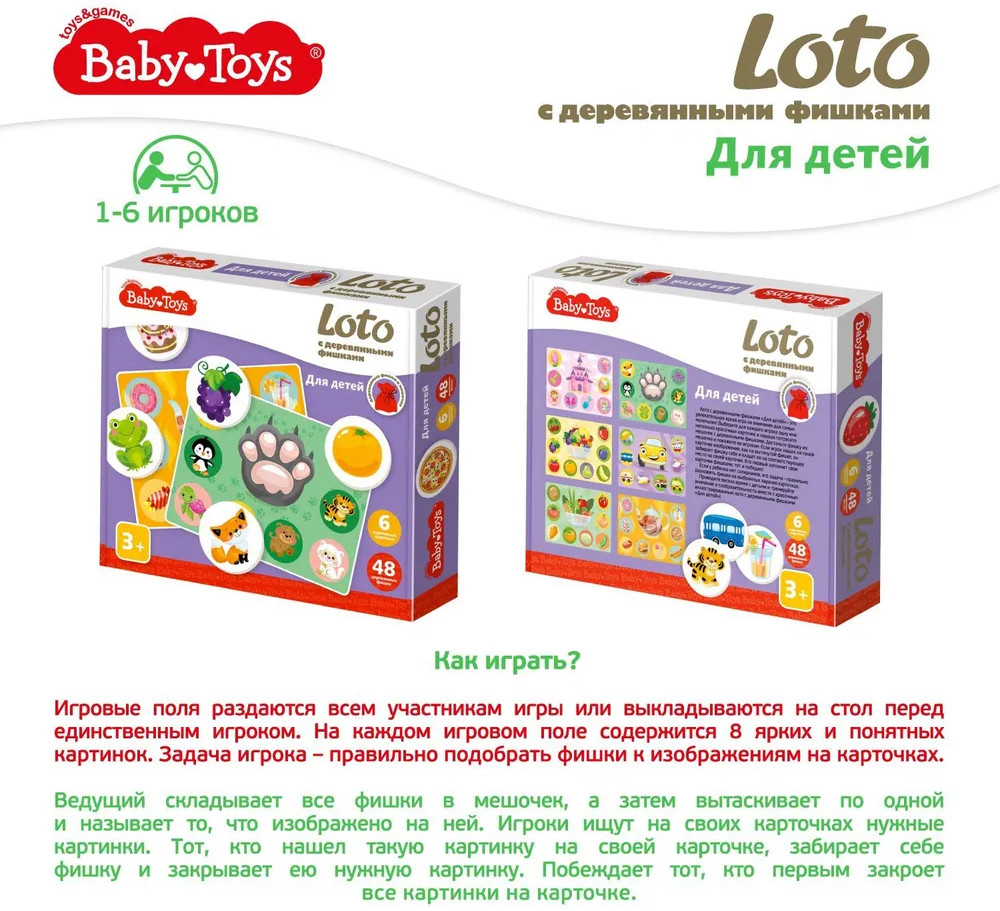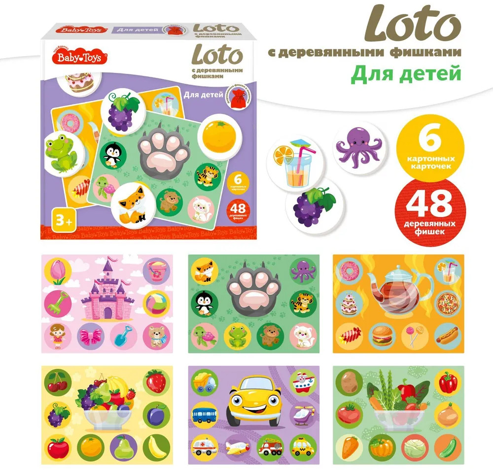 Лото «Для детей» развивает память, внимание, мелкую моторику рук, знакомит с новыми словами и расширяет кругозор малыша. |