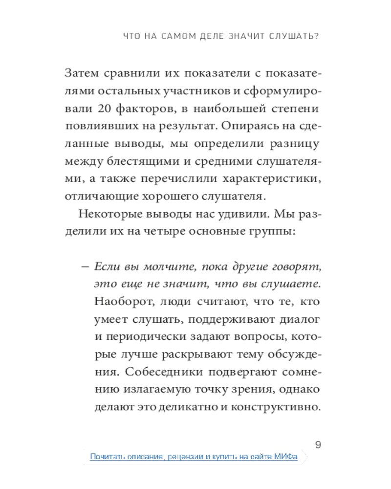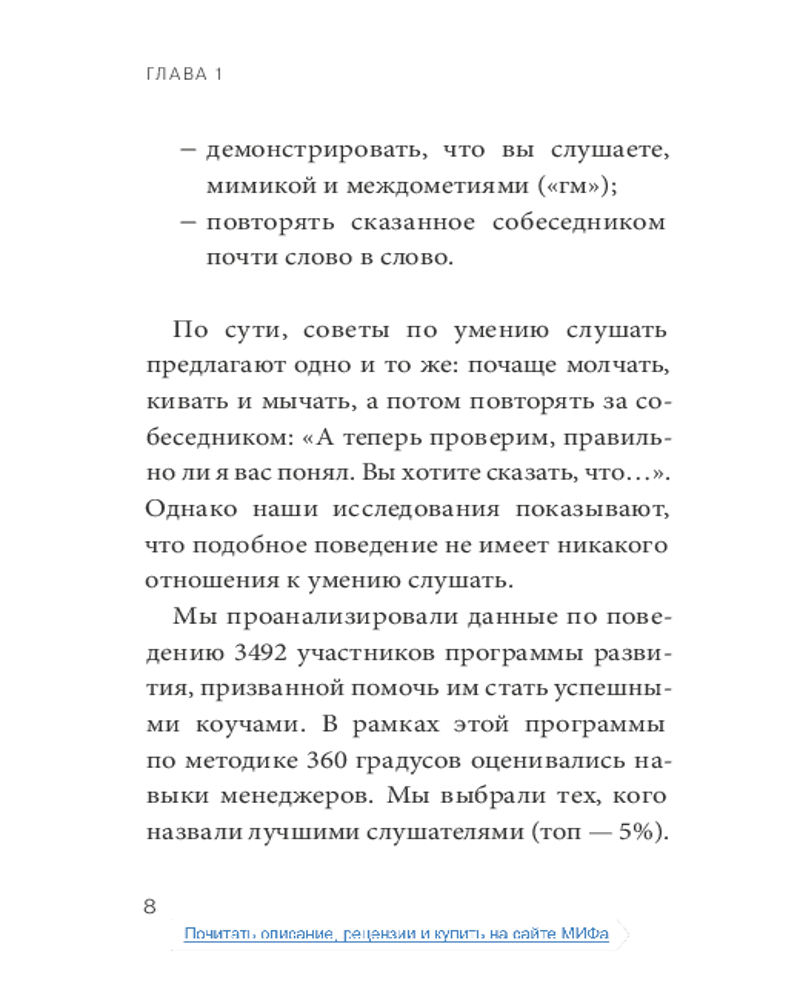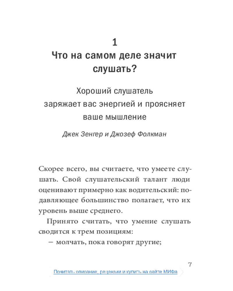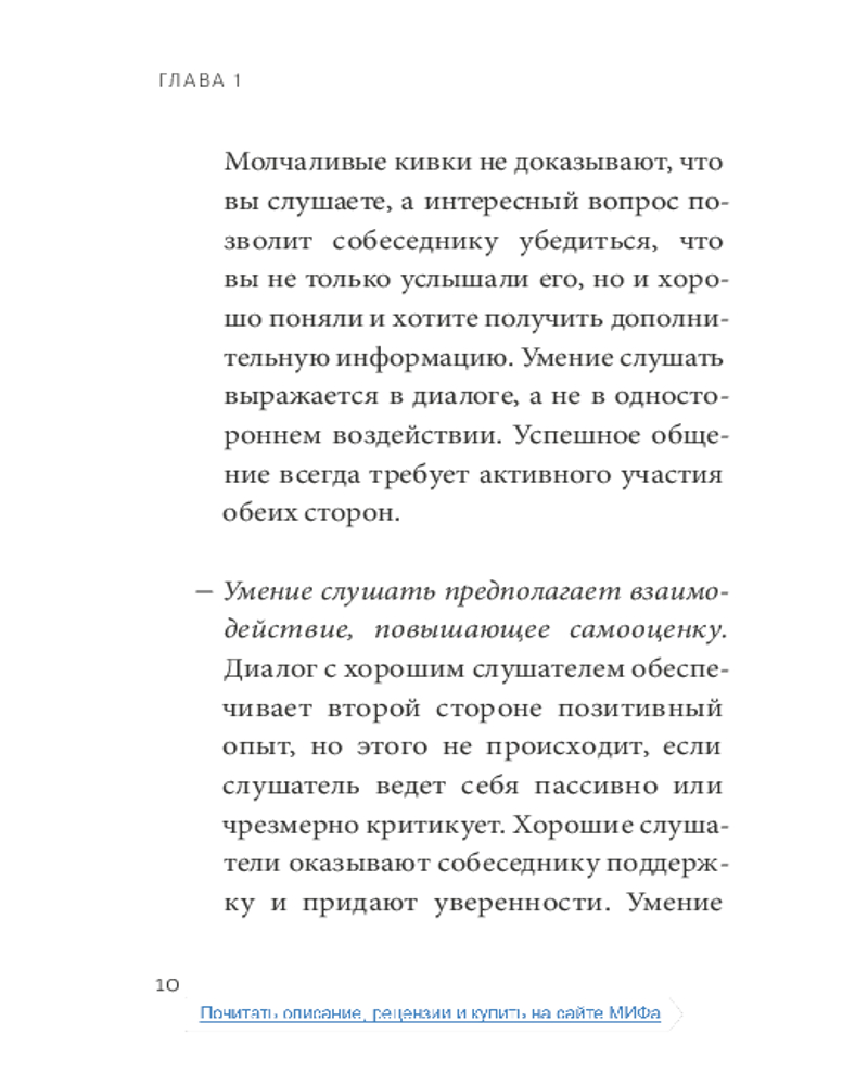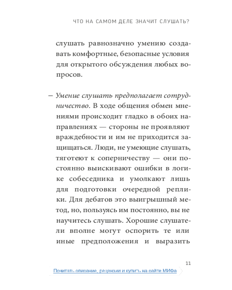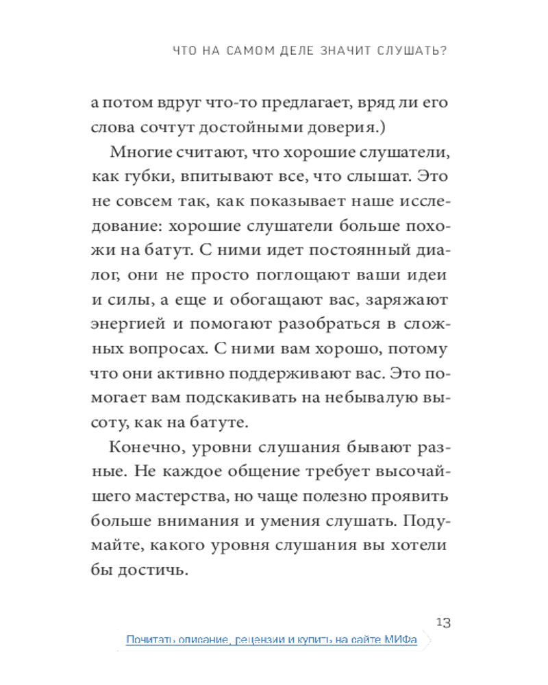 Традиционно многие воспринимают умение слушать как умение изображать из себя губку, впитывающую слова собеседника. Но наиболее эффективный метод слушания — играть роль батута: давать собеседнику энергию, ускорение, высоту и размах. Умение слушать — это желание действительно захотеть узнать что-то новое и понять интересы других сторон. Не просто слышать слова, а обратить внимание на истинные потребности, ценности и взгляды людей.