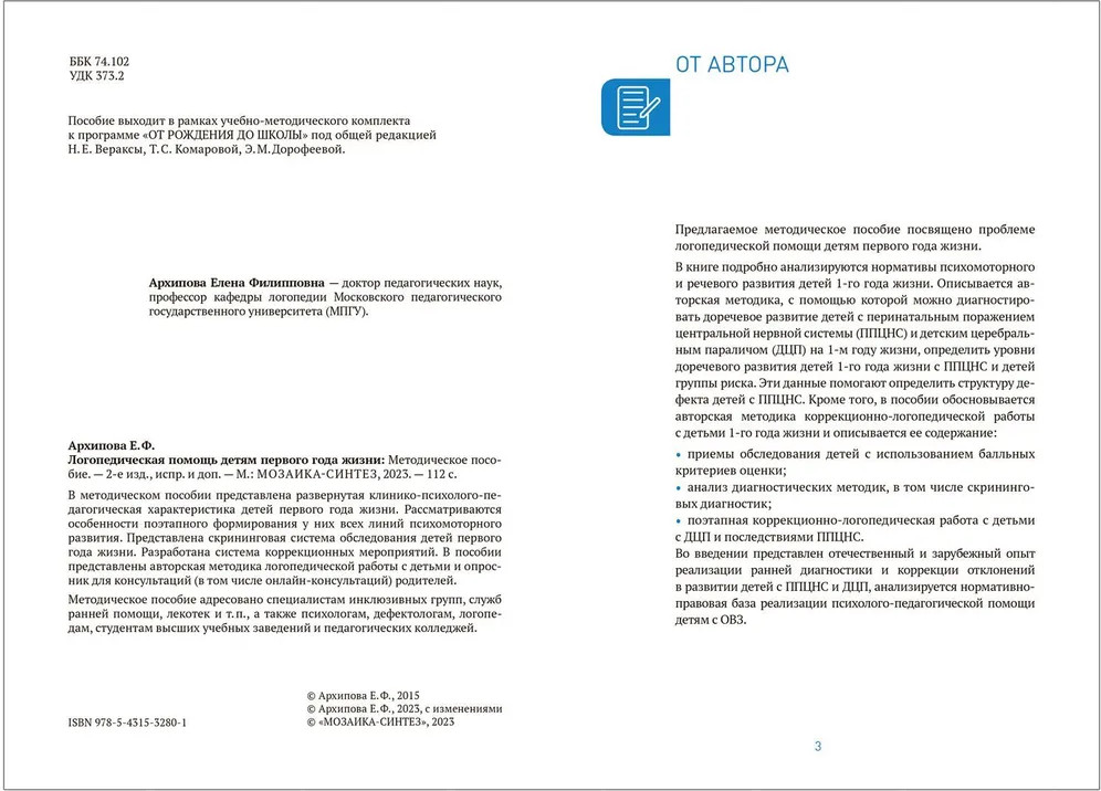 💳 Оплатить за товар можно при получении 🇰🇿 Есть бесплатная доставка по Казахстану от 1 дня 🎁 Копите бонусы с каждой покупки В методическом пособии представлена развернутая клинико-психолого-педагогическая характеристика детей первого года жизни. Рассматриваются особенности поэтапного формирования у них всех линий психомоторного развития. Представлена скрининговая система обследования детей первого года жизни. Разработана система коррекционных мероприятий. В пособии представлены авторская методика логопедической работы с детьми и опросник для консультаций (в том числе онлайн-консультаций) родителей. |