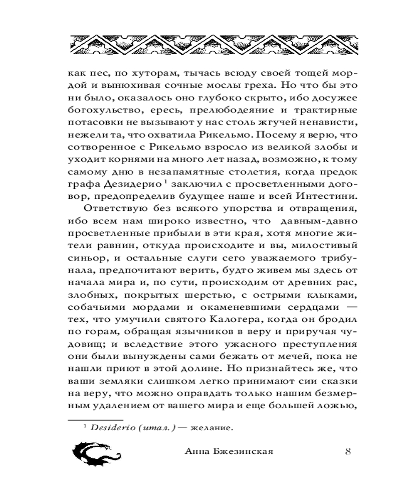 💳 Оплатить за товар можно при получении 🇰🇿 Есть бесплатная доставка по Казахстану от 1 дня 🎁 Копите бонусы с каждой покупки Серия: Шедевры фэнтези В деревне Чинабро погибает при очень странных обстоятельствах недавно приехавший инквизитор. В его смерти обвиняют женщину по прозвищу Ла Веккья. Ее ненавидят многие местные жители, и, казалось бы, дело простое, но уж слишком непривычно ведет себя обвиняемая на допросах, уж слишком необычную историю рассказывает, несмотря на пытки и дознания. И просто так отмахнуться от нее нельзя, ведь по преданиям когда-то здесь жили драконы, и они до сих пор спят под землей, из-за чего в местных горах есть вермилион, чудесный минерал, способный излечивать от всех болезней и даровать бессмертие. По крайней мере, так говорят люди. Вот только добывать его могут лишь живущие поблизости язычники, что зовут себя просветленными, и гибель инквизитора как-то связана со всем этим. Множатся версии, реальность борется с неизвестностью, истина ускользает. Возможно, драконы уже пробудились, и теперь неизвестно, кому грозит большая опасность: обвиняемой или ее палачам. |